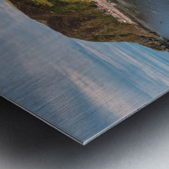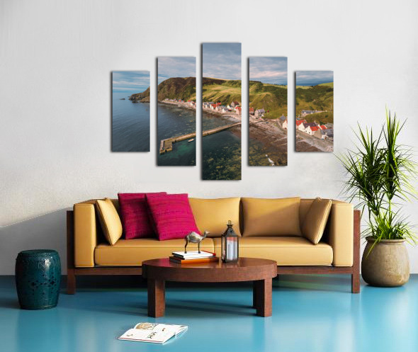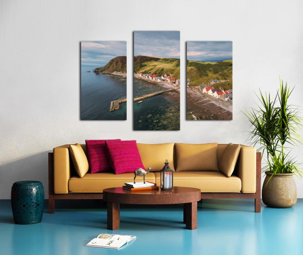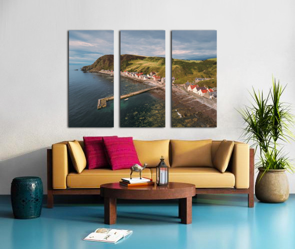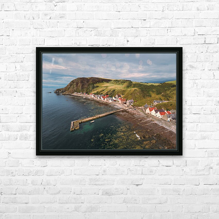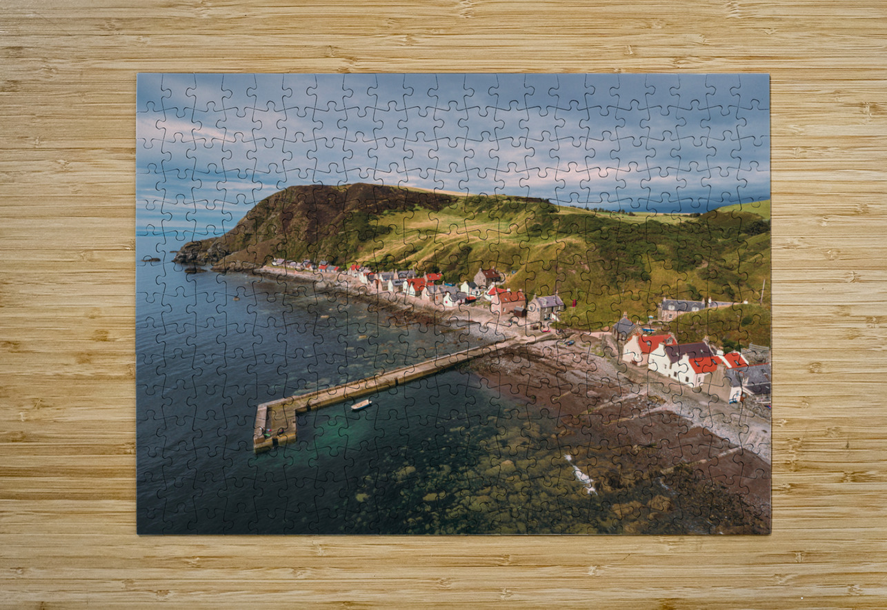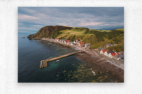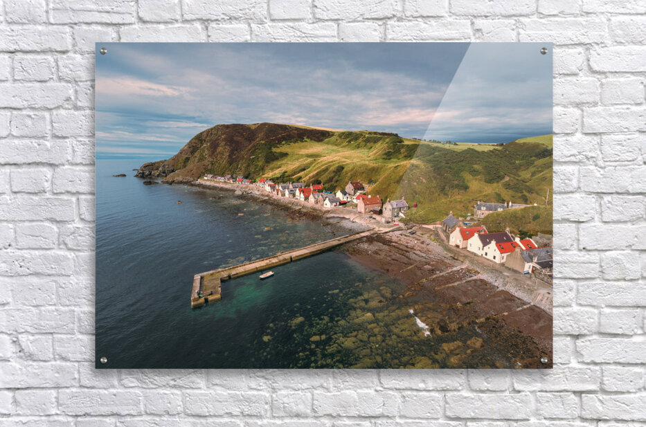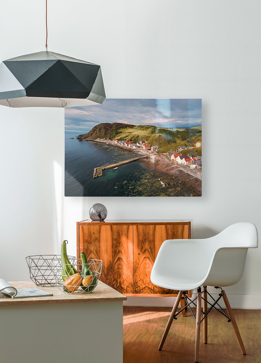 A serene aerial view of Crovie village on a summers evening located in Aberdeenshire Scotland. The photograph captures the tranquil charm of the village nestled along the coastline with soft light casting over the houses and the sea. The vibrant yet peaceful atmosphere of this coastal village is highlighted by the gentle hues of the evening sky and the surrounding natural landscape. The ideal photograph for those looking to add a touch of coastal beauty to their home or office décor.