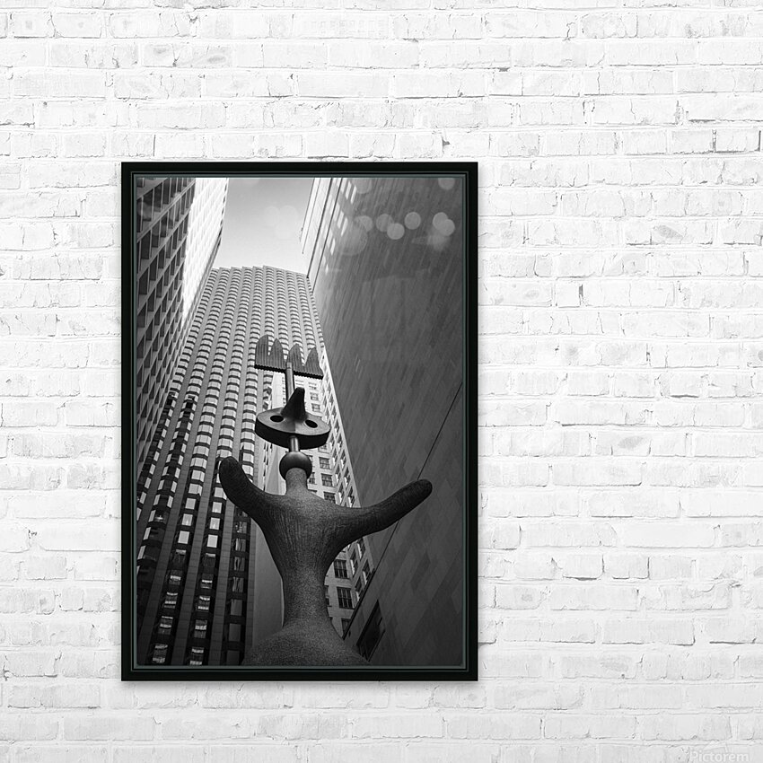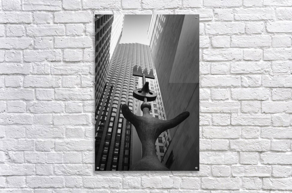 A black and white photograph of Joan Mirós Chicago sculpture captured from a low angle to highlight its towering presence among the city skyscrapers. Located near the Brunswick Building in downtown Chicago this sculpture also known as The Sun the Moon and One Star stands prominently in the city’s Loop district. The striking angle of the shot accentuates the contrast between the abstract form of the sculpture and the surrounding urban architecture. A great photograph for architecture enthusiasts or art collectors looking to showcase iconic Chicago landmarks.