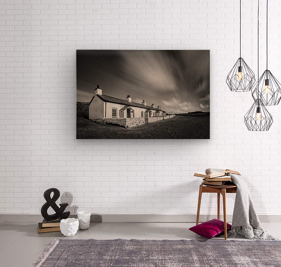 A black and white long exposure photograph capturing the historic Pilot Cottages on Llanddwyn Island a tidal island off the coast of Anglesey in North...[+]