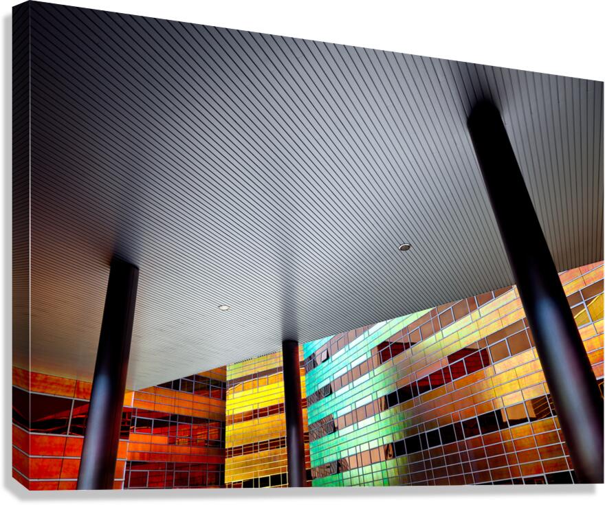A vibrant architectural study of the La Defense building in Almere Netherlands showcasing its striking colors and bold design. The photograph captures the unique structure from a dynamic perspective highlighting the modern geometric shapes and vivid hues that make this building stand out. The ideal photograph for those seeking to add a touch of contemporary architecture and color to their collection.