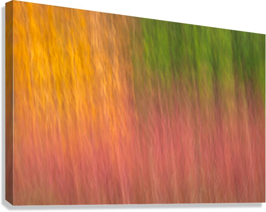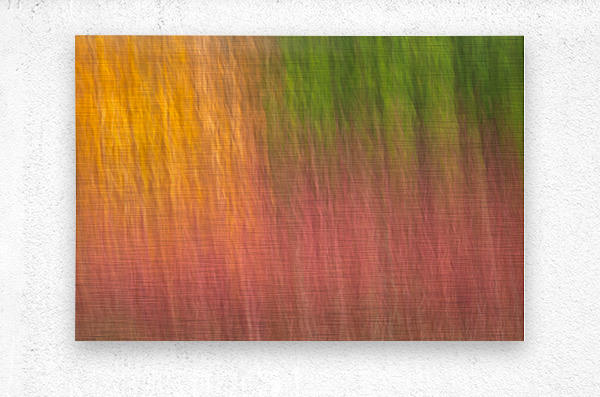 A calming abstract photograph showcasing pastel autumn colors in soft tones of orange green and red. Captured using intentional camera movement ICM within a quiet forest the colors blend and blur seamlessly evoking the gentle shifting beauty of autumn. A great photograph for those who appreciate subtle nature-inspired art with a minimalist touch.