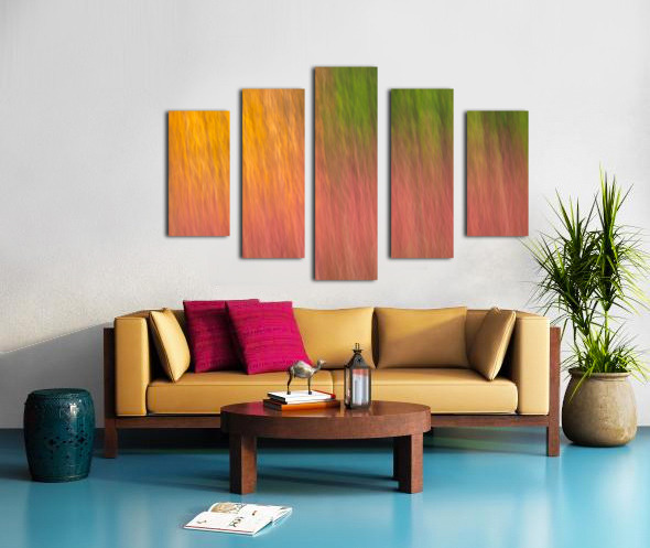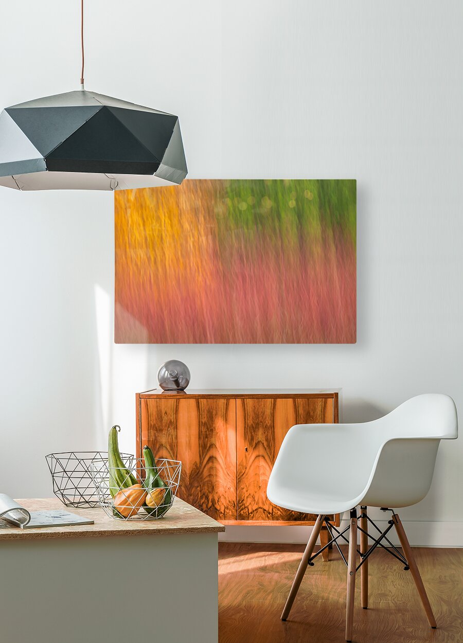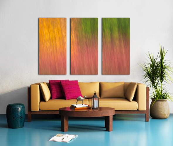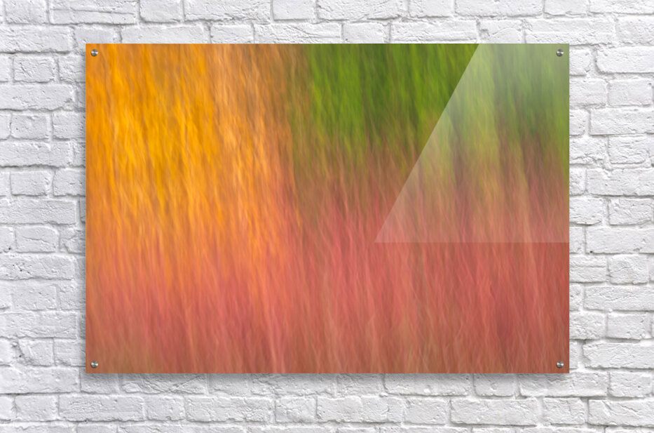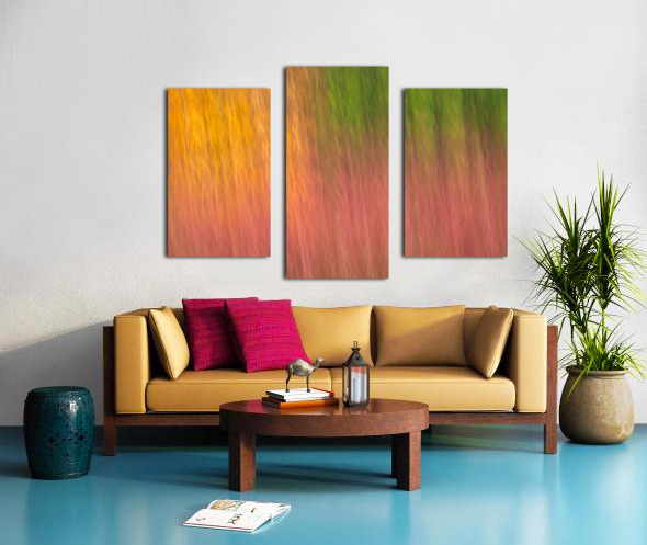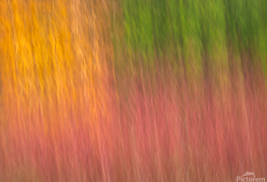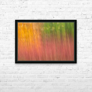 A calming abstract photograph showcasing pastel autumn colors in soft tones of orange green and red. Captured using intentional camera movement ICM within a quiet forest the colors blend and blur seamlessly evoking the gentle shifting beauty of autumn. A great photograph for those who appreciate subtle nature-inspired art with a minimalist touch.
