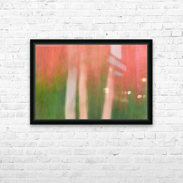 A dynamic abstract photograph of a maple tree captured through intentional camera movement ICM blending vibrant red autumn leaves with lush green foliage. This artistic composition highlights the rich colors and textures of the season creating a striking visual of nature in motion. A perfect photograph for art collectors or those seeking unique seasonal decor.