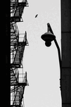 A black and white photograph of a Chicago back alley featuring the stark silhouettes of a fire escape descending the side of a building a solitary street light and a bird in flight overhead. The minimalist composition highlights the interplay of shadow and structure creating a sense of quiet urban solitude. A great photograph for those seeking artwork with a focus on simplicity and architectural forms. ..... Please Note: This image is intentionally presented with a grainy texture as part of its aesthetic.
