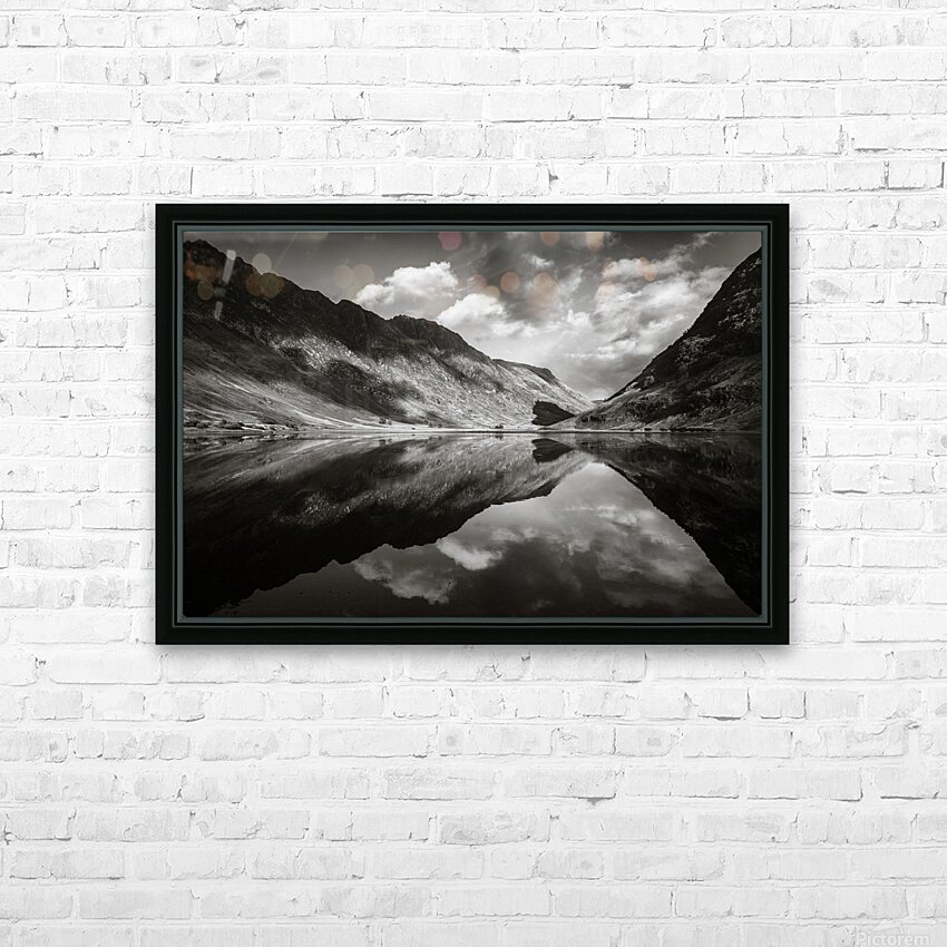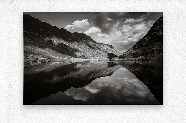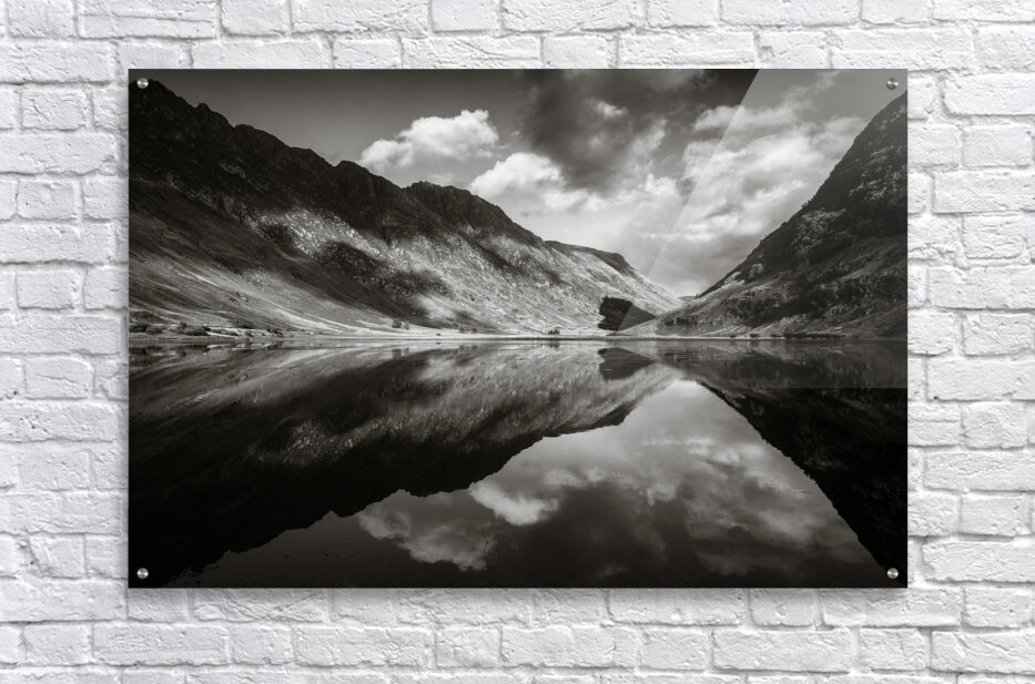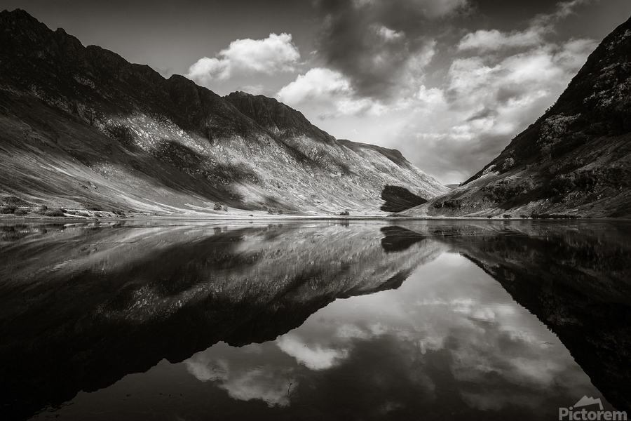 A monochrome photograph of Loch Achtriochtan in the Scottish Highlands, where the still waters of the loch reflect the towering mountains and dramatic...[+]