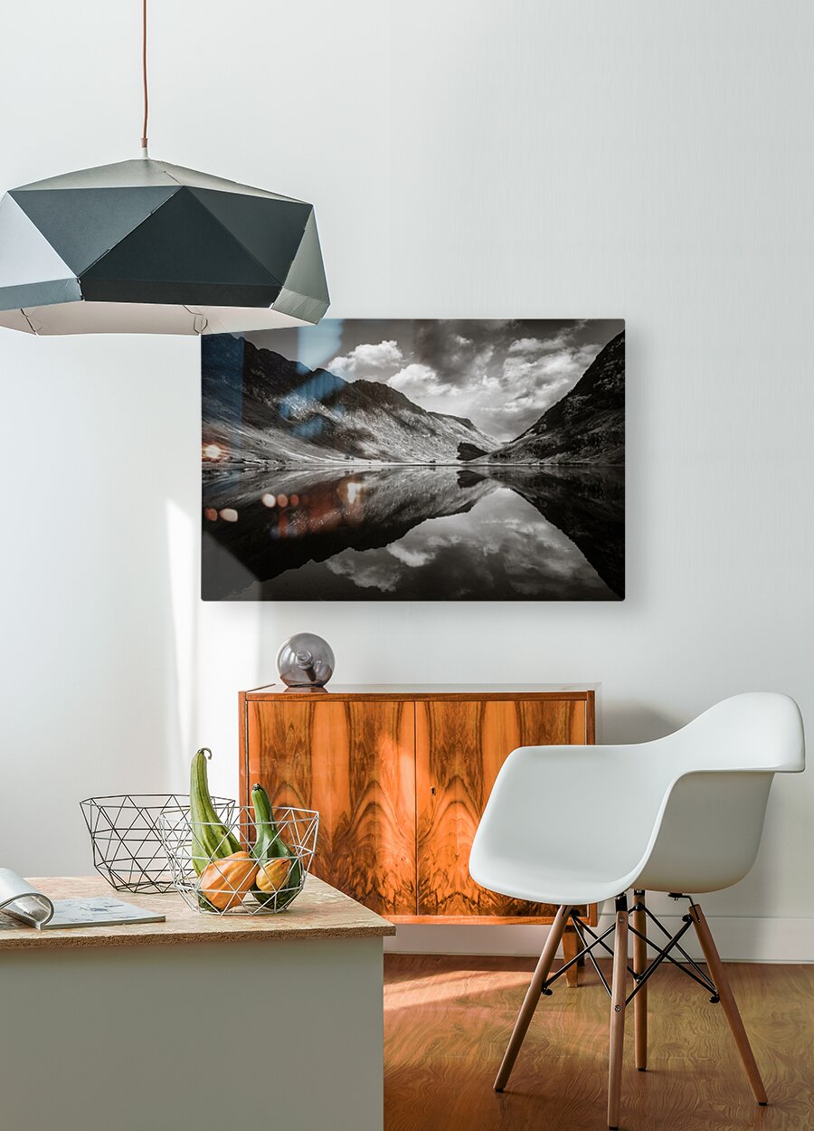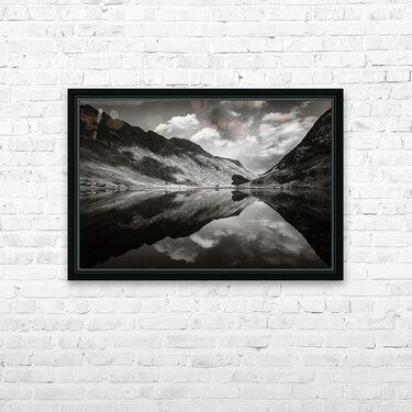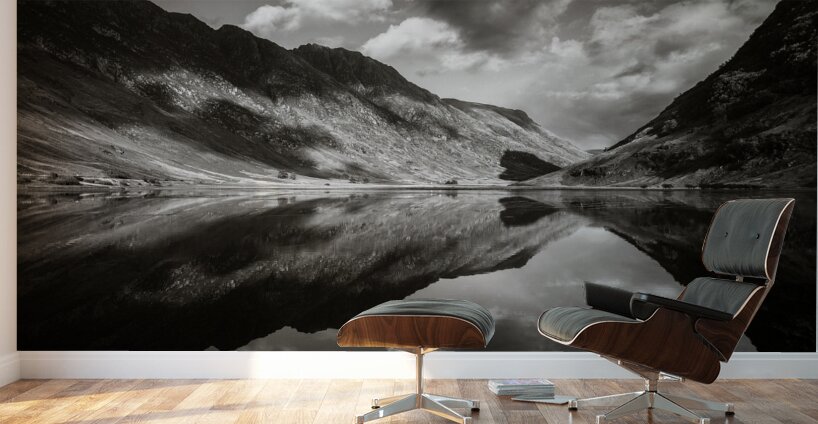 A monochrome photograph of Loch Achtriochtan in the Scottish Highlands, where the still waters of the loch reflect the towering mountains and dramatic clouds. Shadows cast by the clouds add depth to the scene, highlighting the rugged beauty of Glencoe. A perfect photograph for those drawn to atmospheric and timeless landscapes.