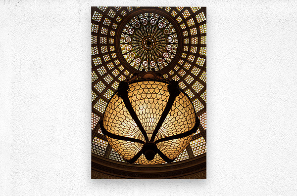 A captivating view of the intricate Tiffany Dome and its elegant chandelier at the Chicago Cultural Center in Chicago Illinois. The domes design showcases a mesmerizing pattern blending glasswork with ornate detailing that reflects the grandeur of this historic landmark. The chandelier hangs gracefully beneath adding a touch of sophistication to the architectural beauty. A perfect photograph for art enthusiasts architecture lovers or anyone who appreciates historic and cultural landmarks.