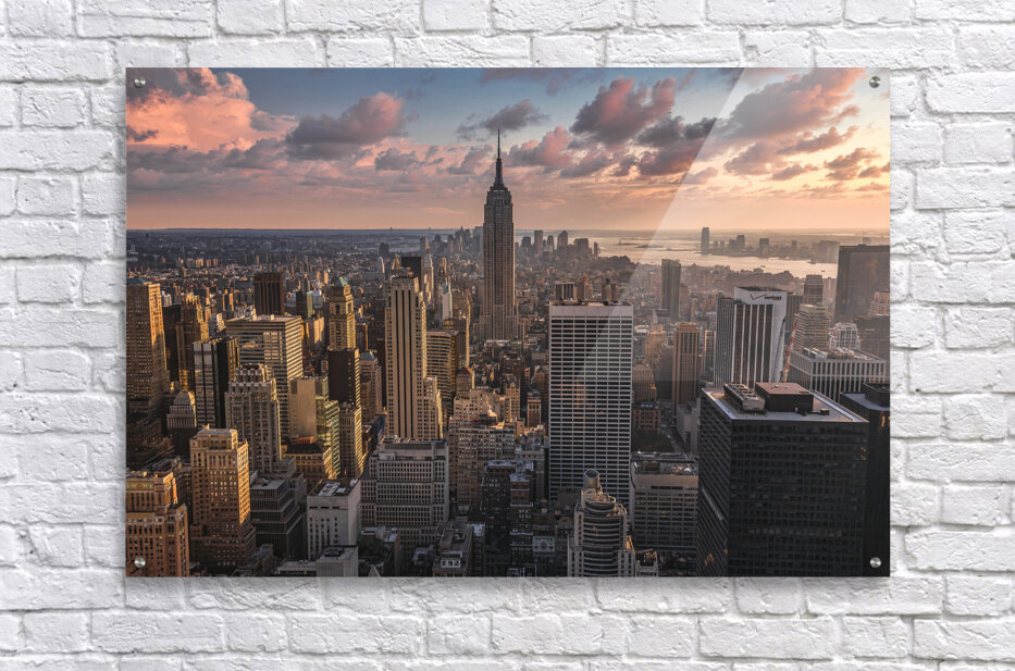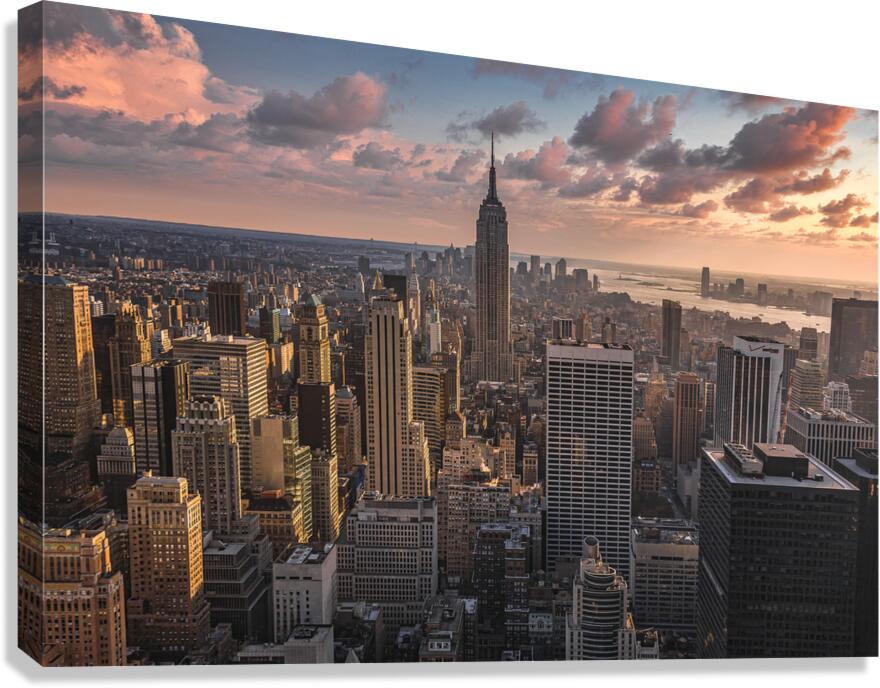 A view of the Empire State Building from the top of the Rockefeller Center at sunset capturing the iconic skyline of New York City in all its grandeur. The warm fading light of the setting sun washes over the urban landscape highlighting the intricate architecture and creating a harmonious balance between the citys energy and the calm of twilight. The pastel tones of the sky add a sense of depth and serenity contrasting beautifully with the bustling city below. A great photograph for lovers of urban landscapes architectural beauty and New York enthusiasts.