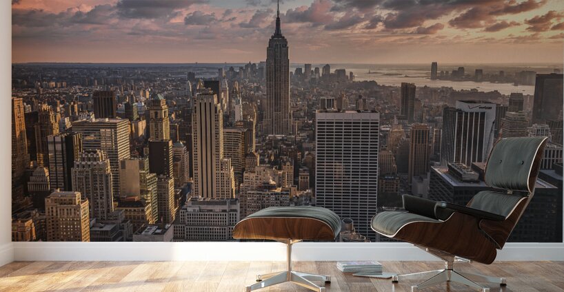 A view of the Empire State Building from the top of the Rockefeller Center at sunset capturing the iconic skyline of New York City in all its grandeur...[+]