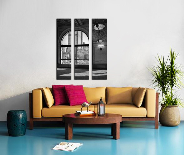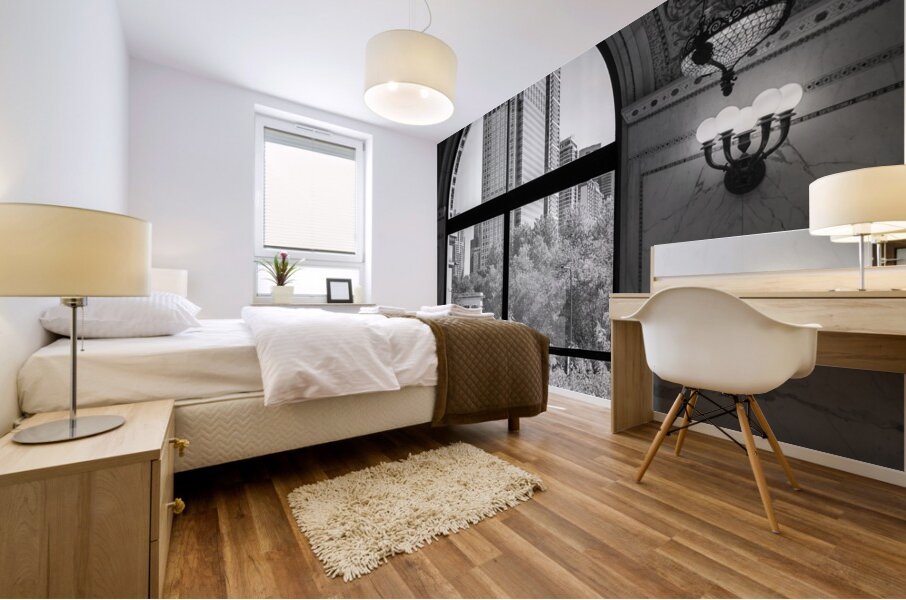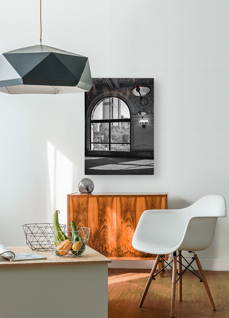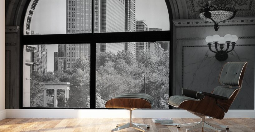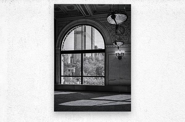 A monochrome photograph capturing the view through one of the arched windows inside the Chicago Cultural Center. The composition includes sunlight streaming onto the floor from another arched window illuminating part of the room with ornate ceiling lights and detailed interior wall designs adding depth to the scene. Through the window a glimpse of the city reveals Wrigley Square and the Millennium Monument. A great photograph for architecture enthusiasts and lovers of urban interiors.