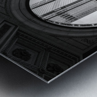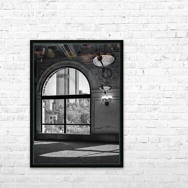 A monochrome photograph capturing the view through one of the arched windows inside the Chicago Cultural Center. The composition includes sunlight str...[+]