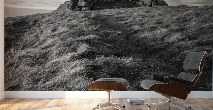 A monochrome photograph of Black Hill War Memorial in Aberdeenshire Scotland capturing its distinctive appearance atop the Black Hill near Stonehaven. The monuments intentionally unfinished design reflects the loss and ruin it commemorates creating a solemn and evocative scene. A great photograph for history enthusiasts or those seeking meaningful and reflective imagery.