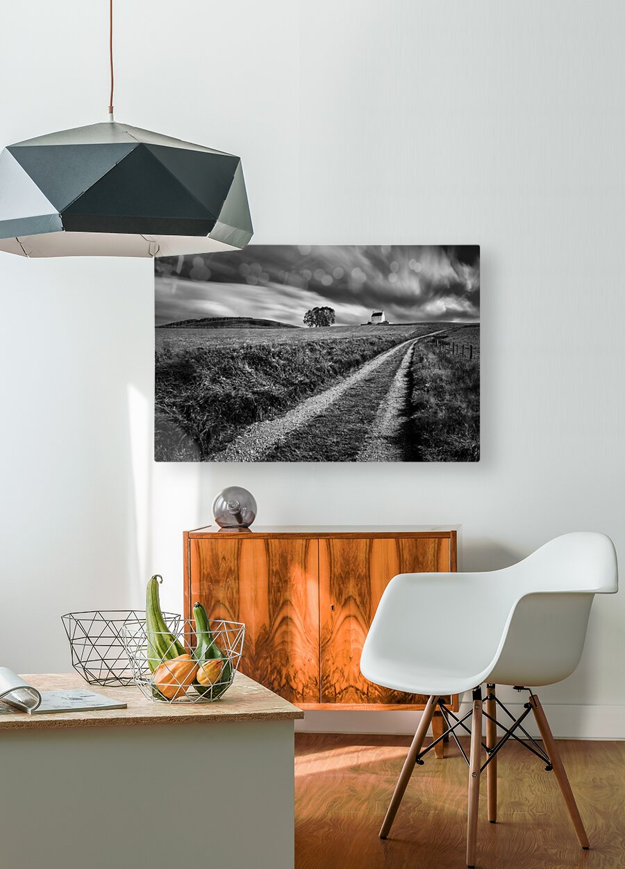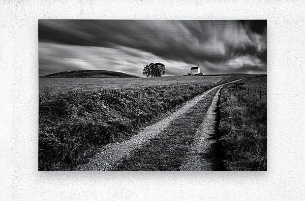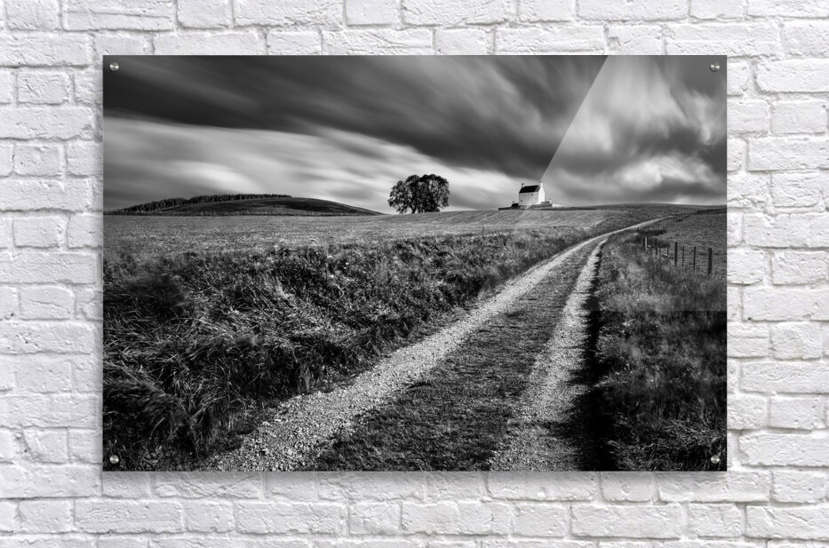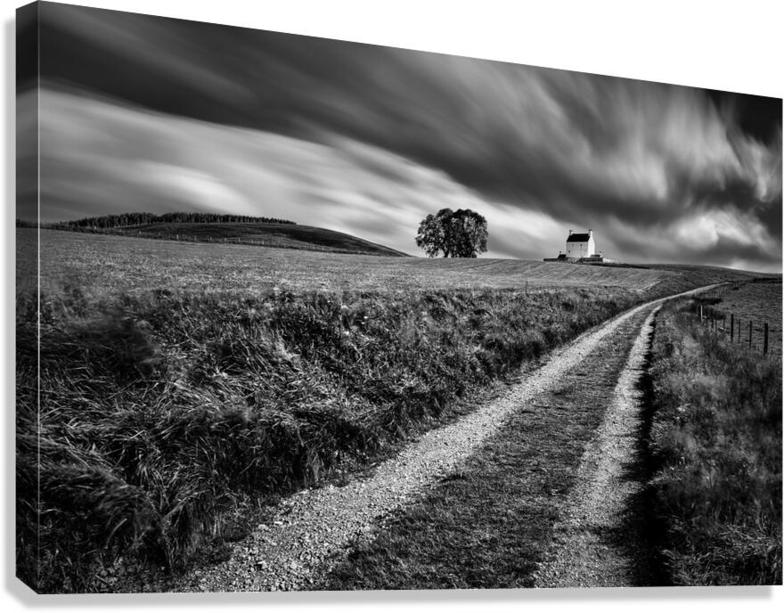 A monochrome long exposure photograph of the tracks leading towards Corgarff Castle in Aberdeenshire Scotland with dramatic clouds streaking across the sky above. The timeless scene captures the essence of Scotland’s rugged landscapes and historic architecture. The ideal photograph for those seeking striking black and white images of Scottish castles and natural scenery.