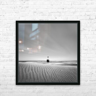 A monochrome long exposure photograph of Rattray Head Lighthouse located in Rattray Scotland. The minimalist style draws attention to the subtle interplay between textures and light. The rippled sand in the foreground creates a natural leading line guiding the viewers gaze toward the distant lighthouse standing as a solitary beacon against the horizon. Delicate streaks of clouds sweep across the sky adding a dynamic yet tranquil element to the scene. A perfect photograph for collectors or anyone who appreciates coastal landscapes and minimalist art