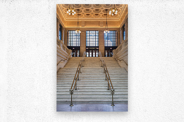 A view looking up the iconic steps of Union Station toward the Canal Street entrance in Chicago capturing the grandeur of this historic train station. Known for its role in the gunfight scene from the film The Untouchables the composition reflects a piece of cinematic and architectural history. A great photograph for movie enthusiasts architecture admirers or those with a connection to Chicago’s rich heritage.