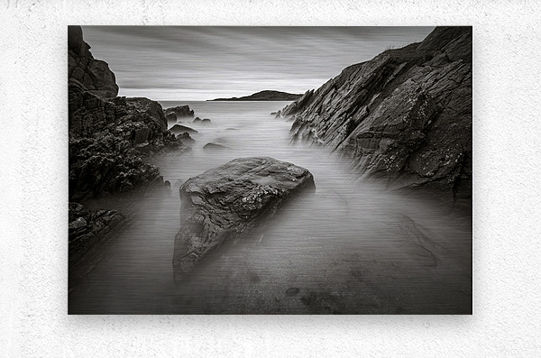 A monochrome photograph of the view out to sea from Ardalanish Beach on the Isle of Mull Inner Hebrides Scotland. This long exposure captures the rugg...[+]