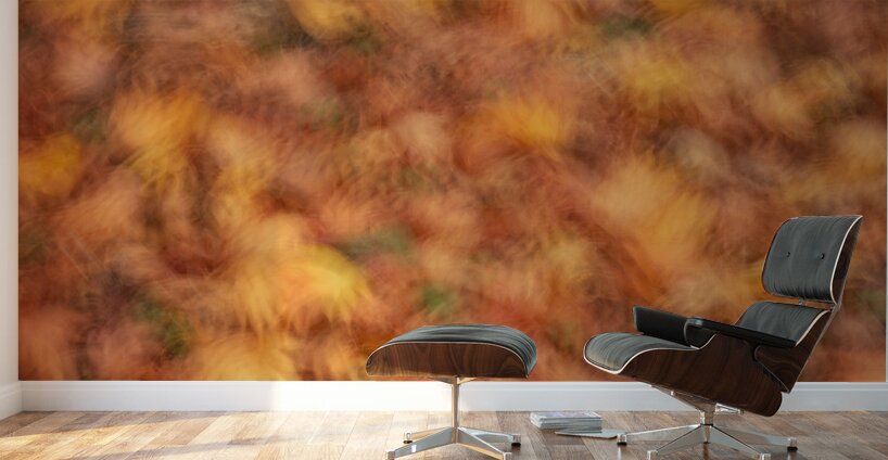 A vibrant abstract photograph of autumn leaves captured with long exposure and intentional camera movement ICM. The image blends the fiery reds oranges and yellows of the leaves into a dynamic chaotic burst creating a sense of motion and energy. The ideal photograph for nature enthusiasts abstract art lovers and those seeking bold colorful imagery.