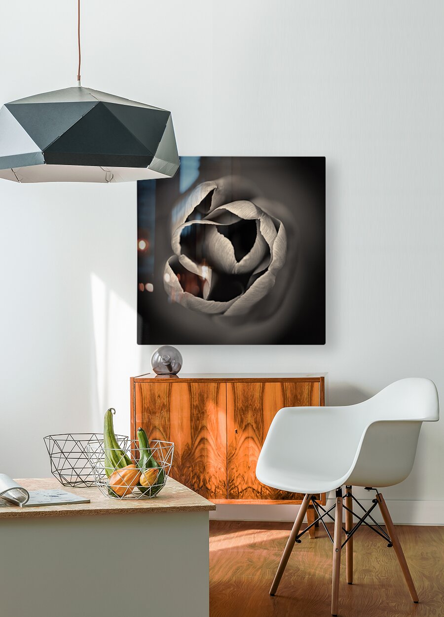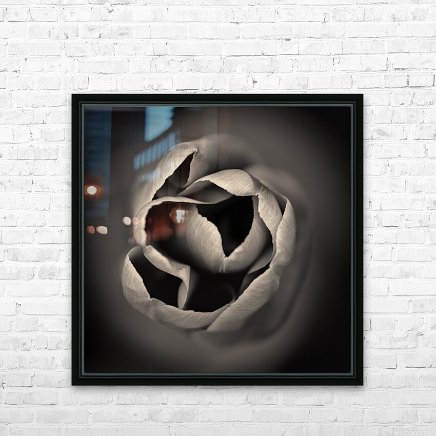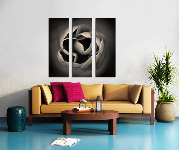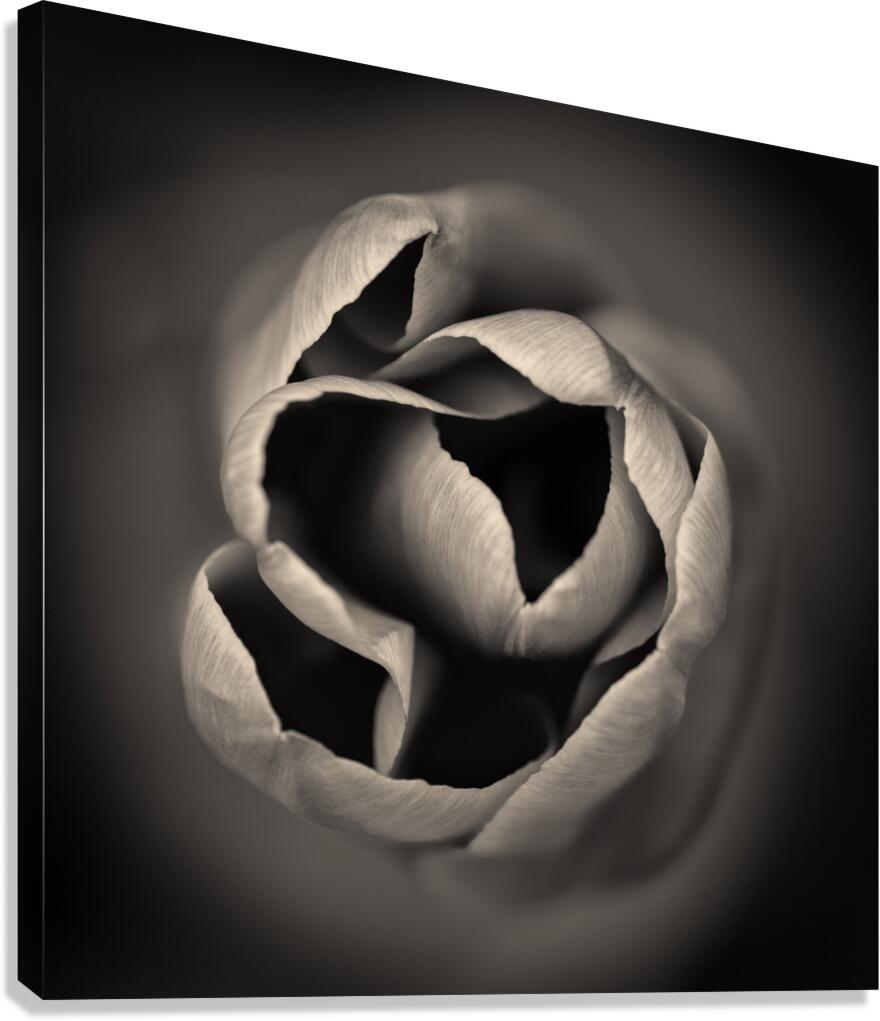 A monochrome abstract study of the delicate tips of a tulips petals capturing the intricate shapes and subtle textures of the flowers natural form. The high contrast tones highlight the smooth curves and intricate details offering a striking and minimalist composition. The ideal photograph for those looking to add a unique floral element to their collection or home decor.