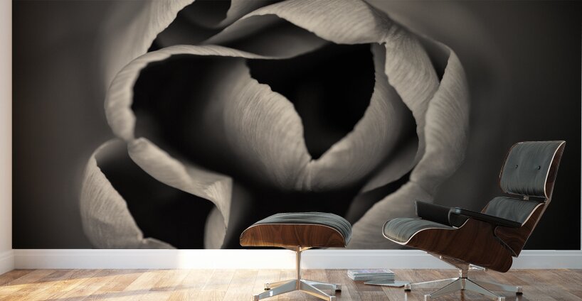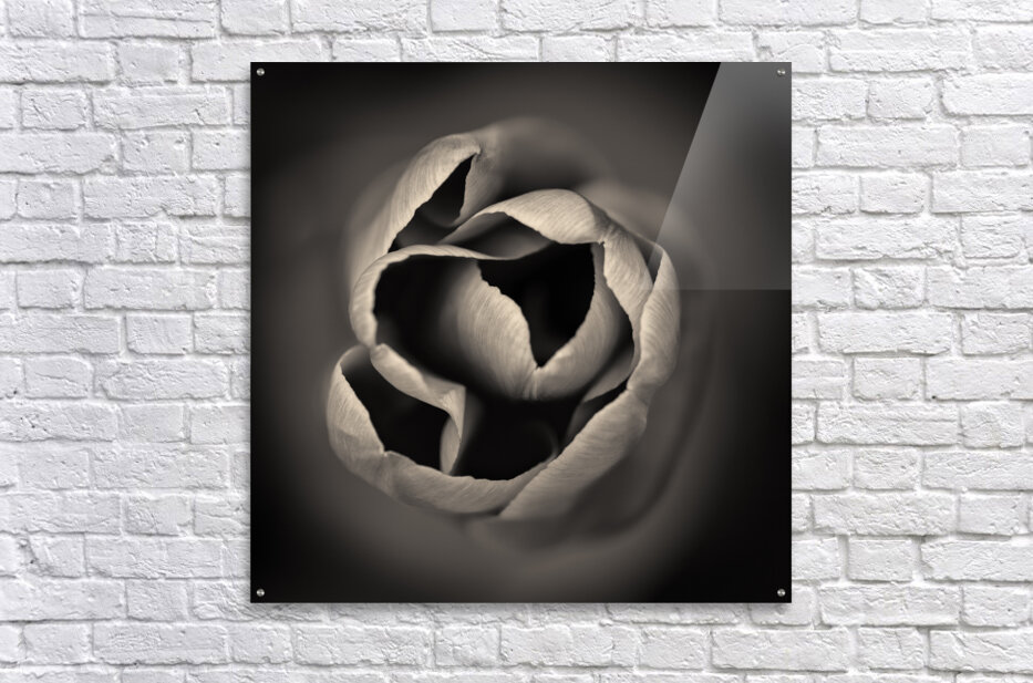 A monochrome abstract study of the delicate tips of a tulips petals capturing the intricate shapes and subtle textures of the flowers natural form. The high contrast tones highlight the smooth curves and intricate details offering a striking and minimalist composition. The ideal photograph for those looking to add a unique floral element to their collection or home decor.