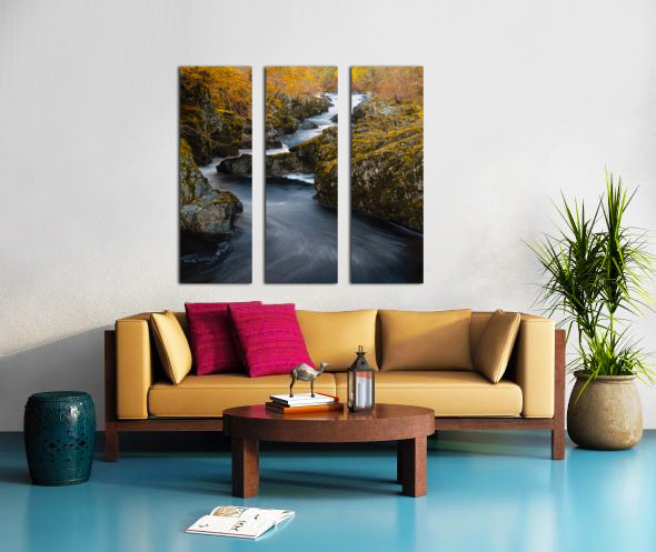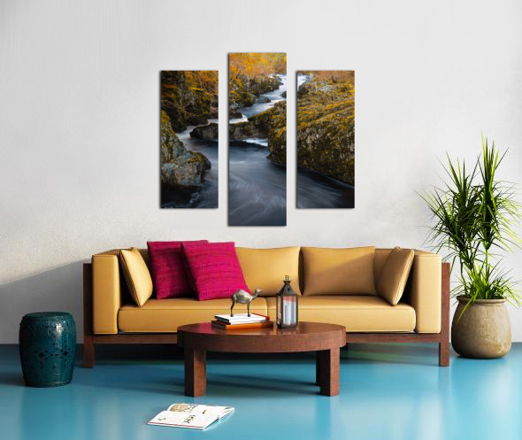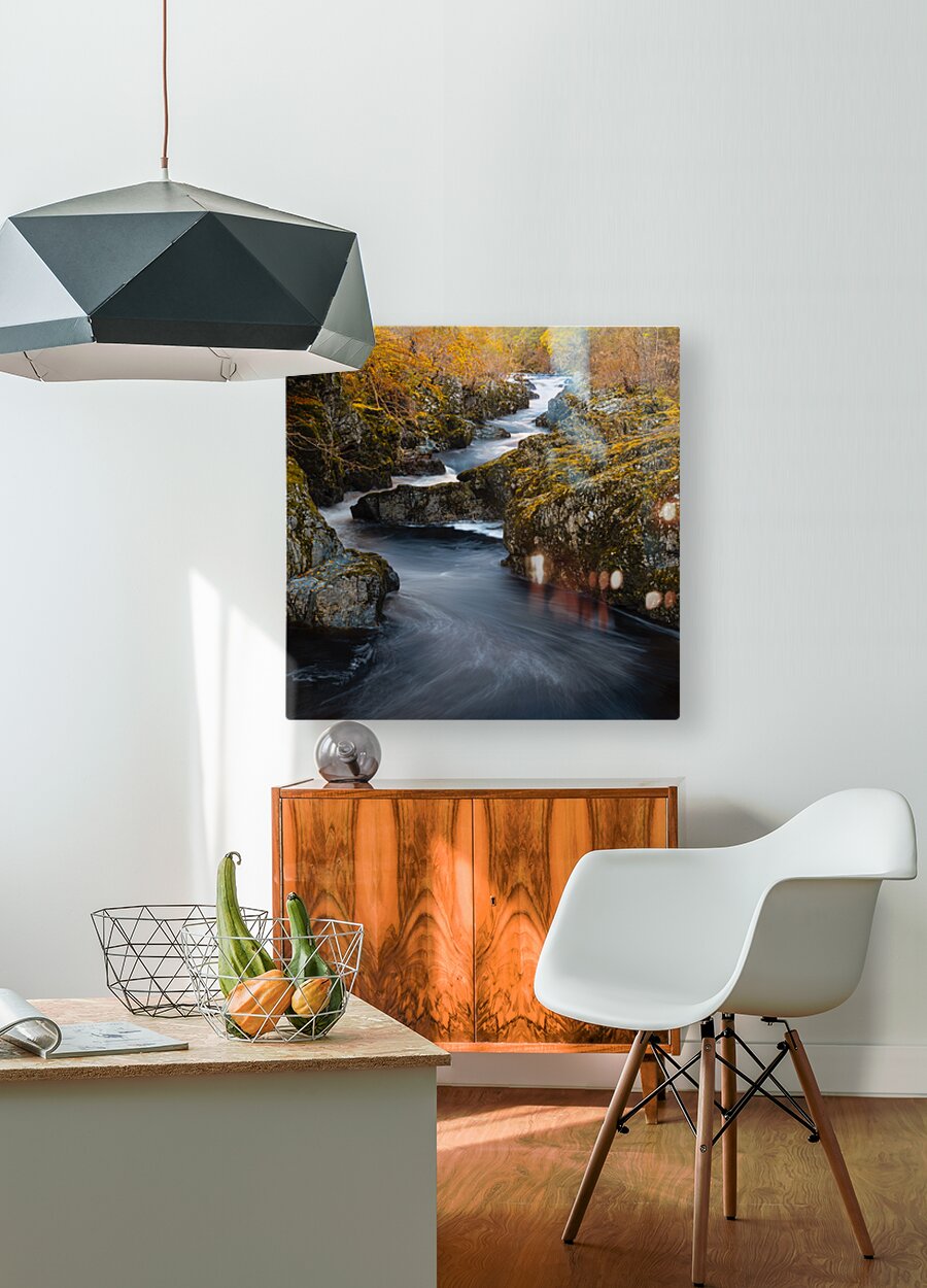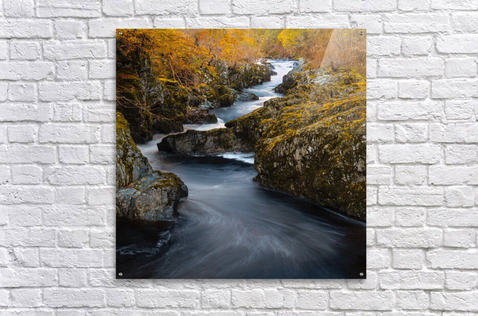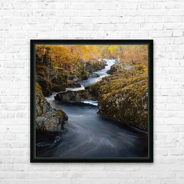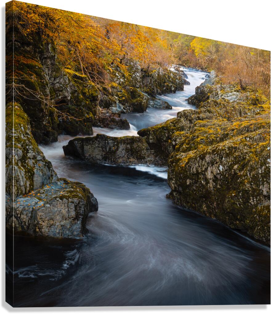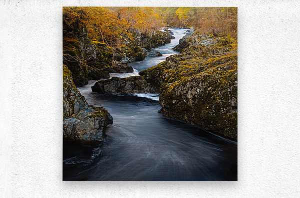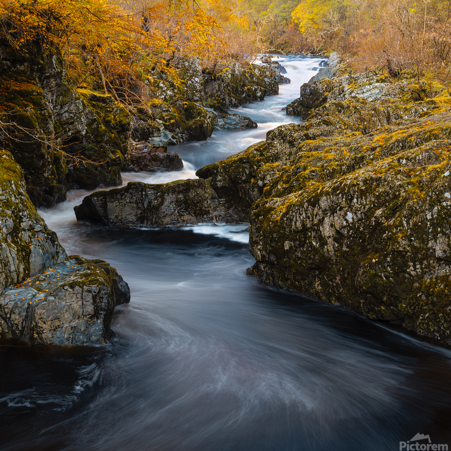 A serene autumn scene of the River North Esk flowing between the rugged Rocks of Solitude near Edzell Angus Scotland. The slight long exposure enhances the rivers movement creating a smooth flowing effect as it winds through the natural rock formations. A great photograph for nature enthusiasts or those seeking to bring the essence of autumn landscapes into their space.