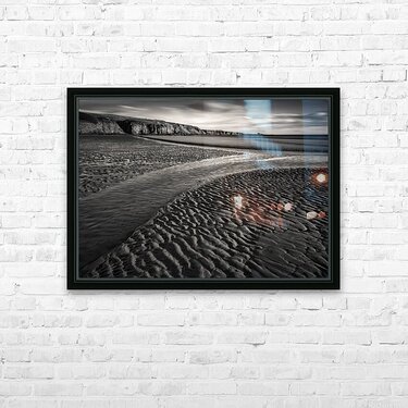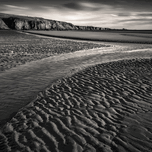 A monochrome moody view of sand ripples at Lunan Bay in Angus Scotland captured with a long exposure. A rivulet runs across the beach winding through the textured ripples while dramatic cliffs rise in the background. Streaks of clouds move across the sky adding to the atmospheric scene. The ideal photograph for those seeking a serene and dramatic coastal landscape.