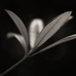A monochrome photograph of an evergreen leaf set against a dark woodland backdrop. The soft focus highlights the intricate details of the leaf with a ...[+]