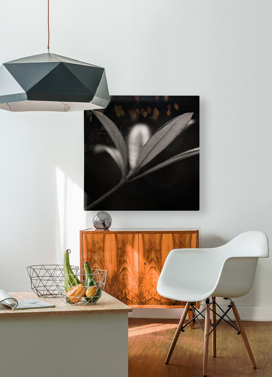 A monochrome photograph of an evergreen leaf set against a dark woodland backdrop. The soft focus highlights the intricate details of the leaf with a warm tone adding depth and texture to the image. The grainy effect enhances the natural organic feel of the scene making it a striking fine art piece. The ideal photograph for nature enthusiasts and collectors of fine art looking to bring a sense of tranquility to their space.