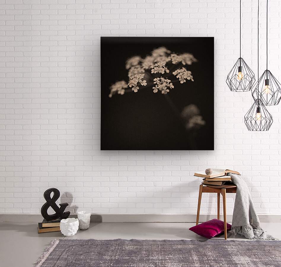 A monochrome image of a white wildflower in a woodland setting highlighted against a dark background with soft out-of-focus surroundings. The photograph has a warm tone and a textured grainy finish giving it a classic fine art feel. A perfect photograph for nature lovers and fine art collectors seeking a unique emotive portrayal of the natural world.