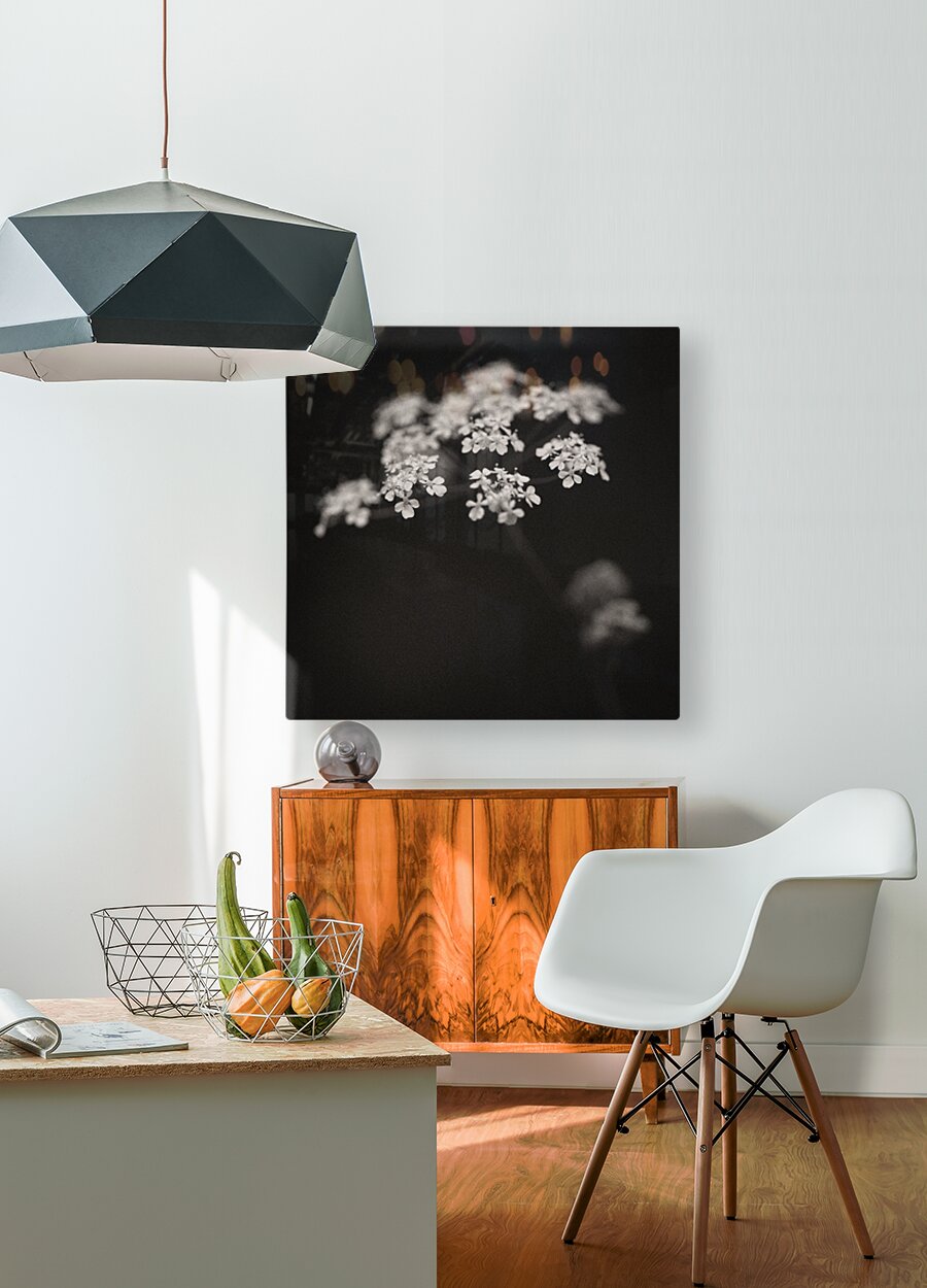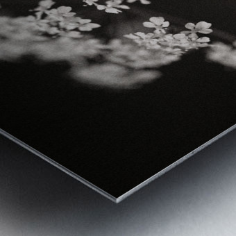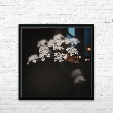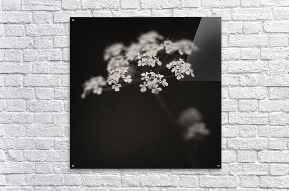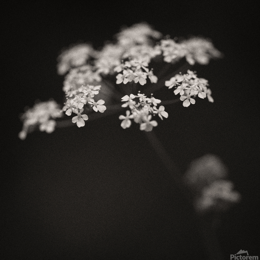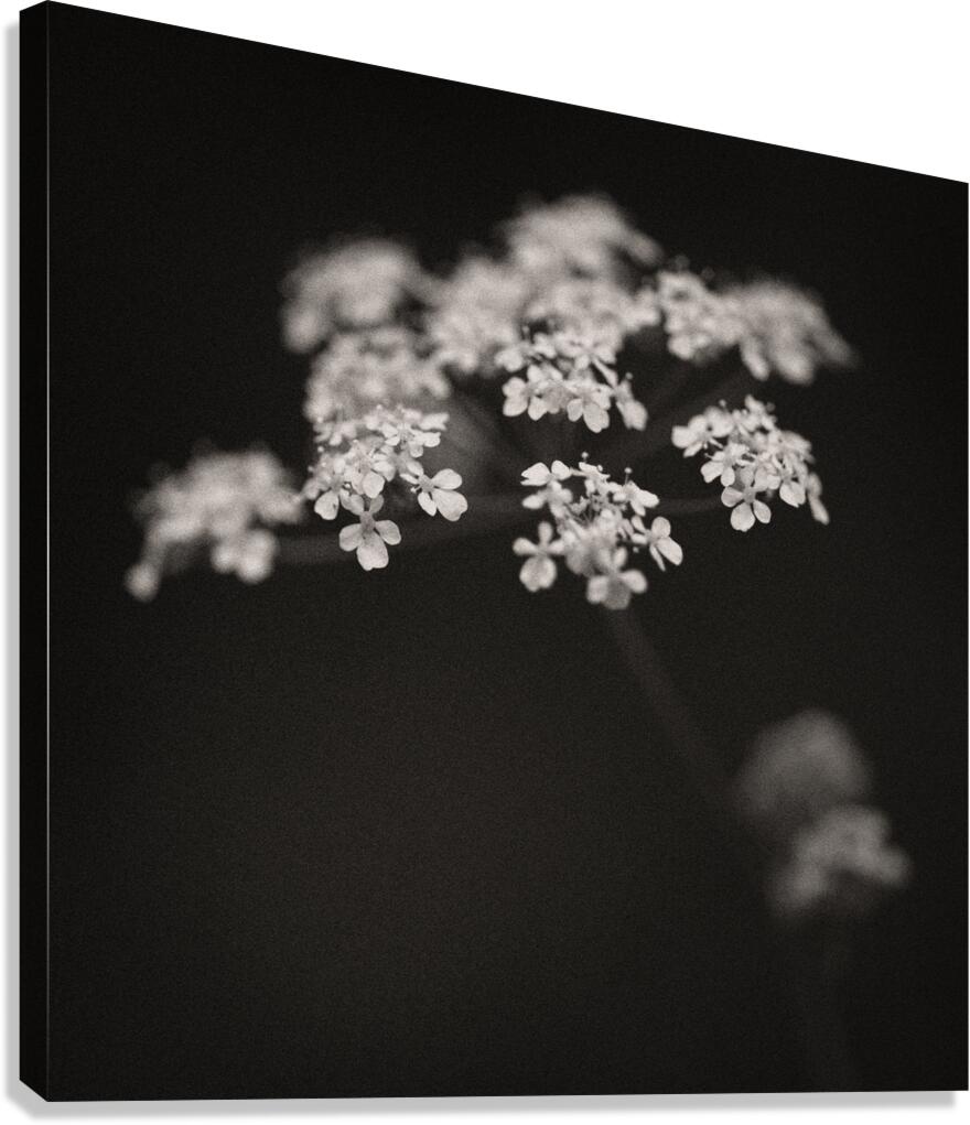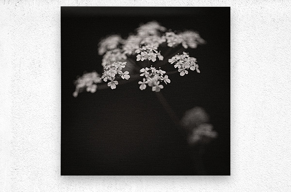 A monochrome image of a white wildflower in a woodland setting highlighted against a dark background with soft out-of-focus surroundings. The photograph has a warm tone and a textured grainy finish giving it a classic fine art feel. A perfect photograph for nature lovers and fine art collectors seeking a unique emotive portrayal of the natural world.