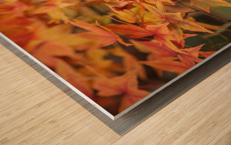 A close-up of vibrant autumn leaves changing color on a Maple tree showcasing a mixture of red orange and yellow hues. The detailed focus highlights the rich textures and the natural beauty of the fall season. The ideal photograph for nature lovers or anyone seeking to add a warm seasonal touch to their home decor.