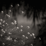 A monochrome study of white wildflower heads in woodland, with the soft focus of the background revealing a reflecting lake. The image features a subt...[+]