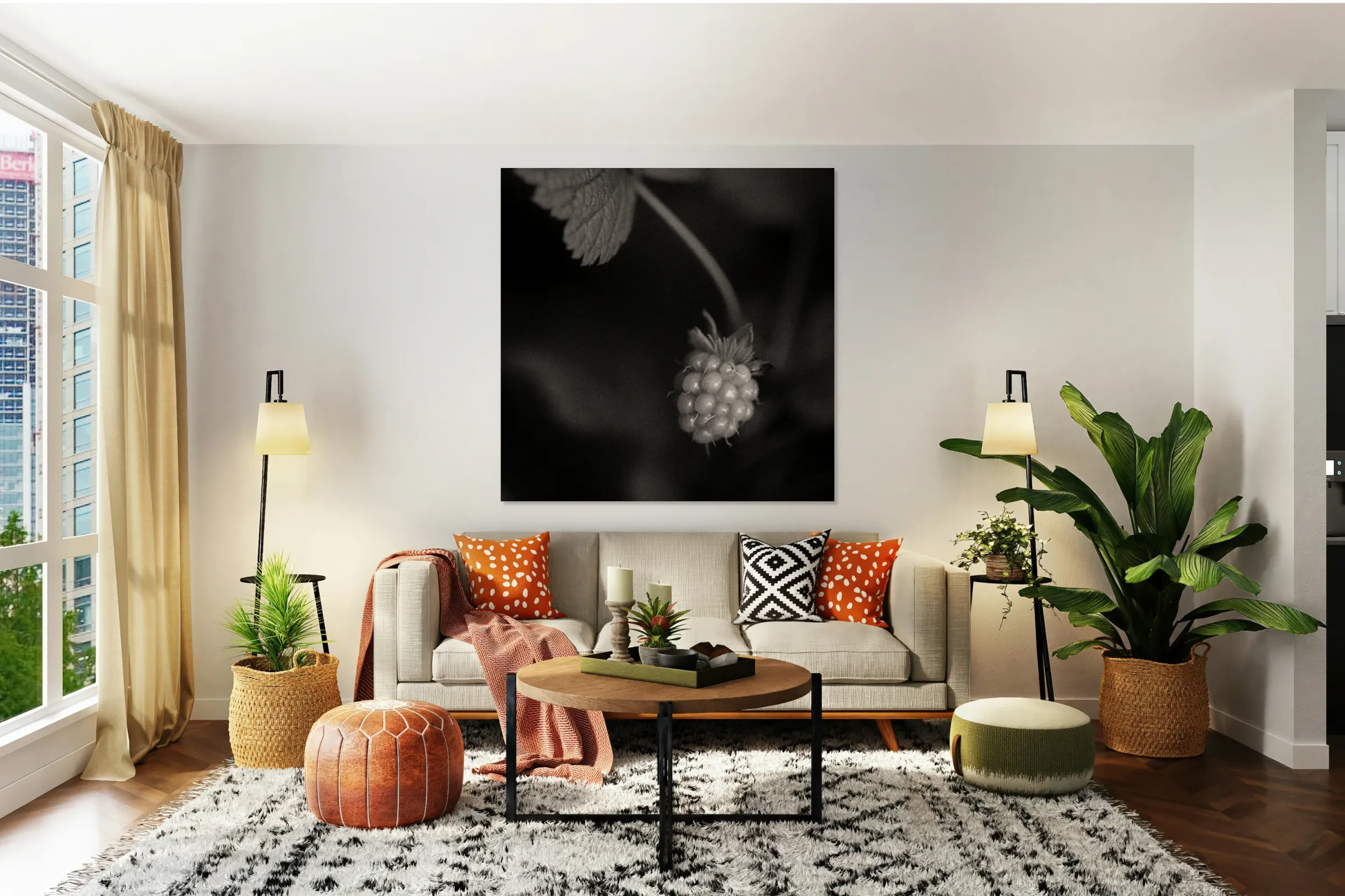 A monochrome study of the emerging fruit of a dewberry plant, set against a dark, blurred background that brings out the fine details of the delicate fruit. The image has a subtle warm tone and a soft, grainy texture, offering a fine art feel. The ideal photograph for nature enthusiasts or those looking to add a touch of organic elegance to their collection.