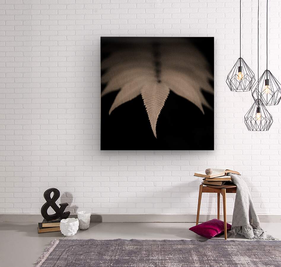 A monochrome study of the tip end of a leaf captured in woodland with soft focus highlighting the intricate details against a dark backdrop. The image features a subtle warm tone and a grainy texture creating a fine art aesthetic. The ideal photograph for nature enthusiasts fine art collectors or those seeking minimalist woodland imagery.