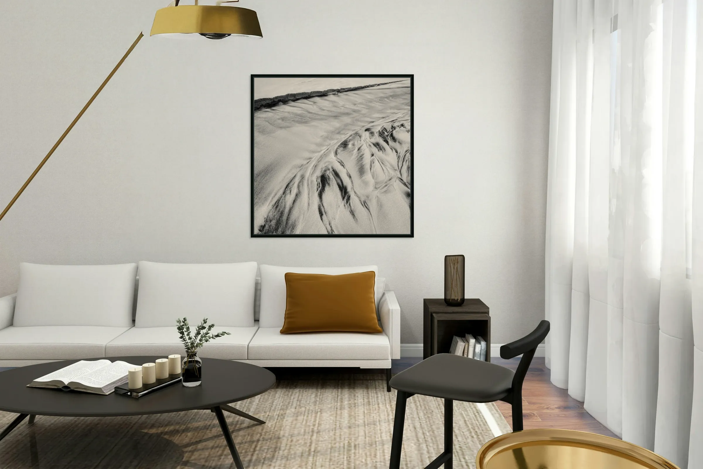 A minimalist monochrome semi-abstract photograph showcasing intricate sand patterns on Dailbeag Beach located on the Isle of Lewis in the Outer Hebrides Scotland. The interplay of textures and tones highlights the natural artistry of the coastal landscape. A perfect photograph for collectors or those seeking refined wall art with a focus on simplicity and natures details.
