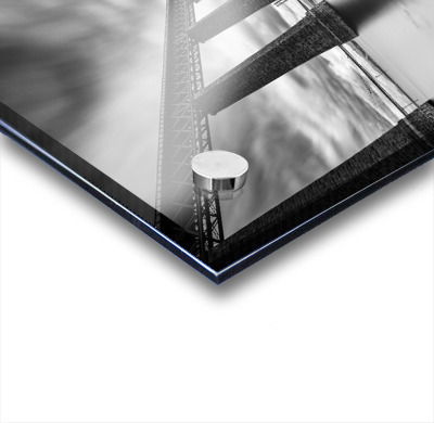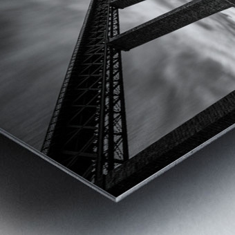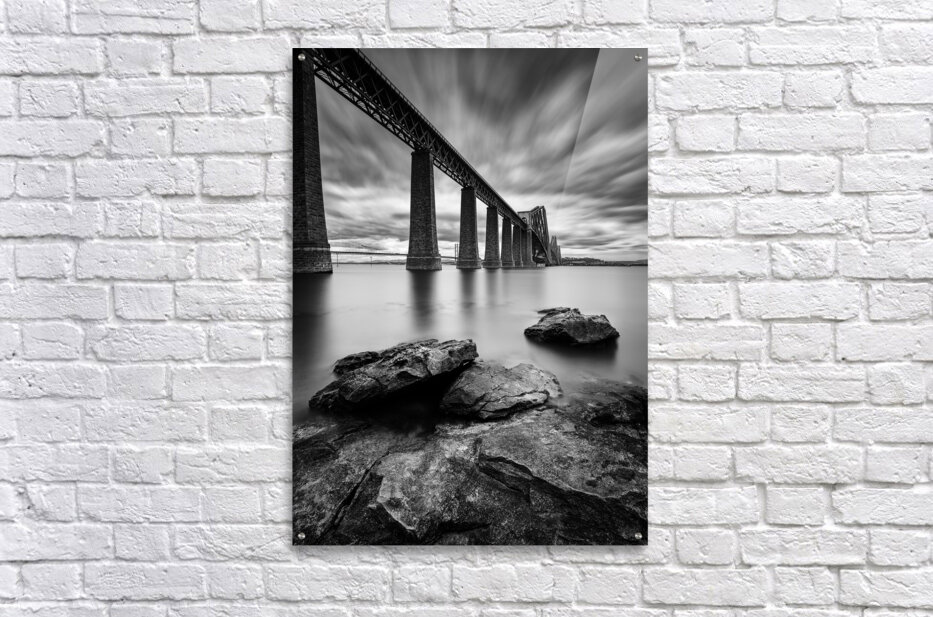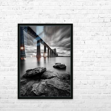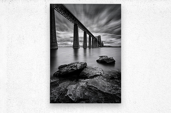 A monochrome long exposure photograph of the Forth Bridge a cantilever railway bridge over the Firth of Forth in eastern Scotland. Taken from the South Queensferry side at water level the image captures the bridge’s intricate design with streaking clouds overhead. A great photograph for those interested in architectural photography and Scottish landmarks.