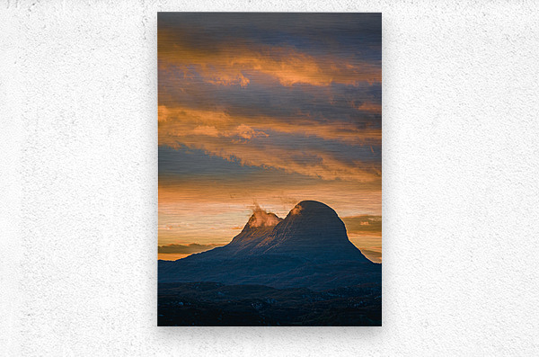 A peaceful moment as the sun sets over Suilven mountain in the Scottish Highlands. The mountain stands in quiet semi-silhouette its rugged slope catching a soft touch of sunlight. Above the clouds are gently painted with the warm orange hues of dusk creating a calming almost reflective scene. A great photograph for anyone who appreciates the beauty of remote landscapes and wants to bring a sense of calm and connection into their space.