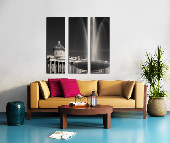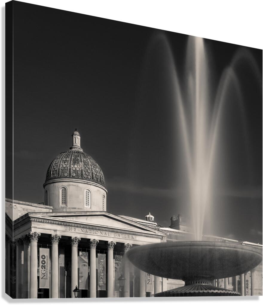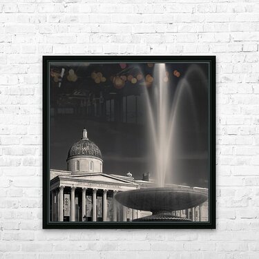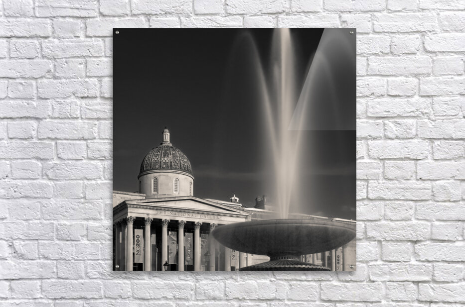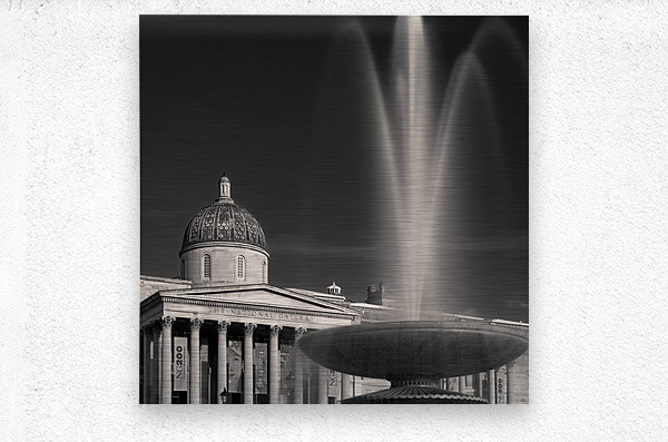 A monochrome photograph of the National Gallery in London framed by the graceful flow of water from one of the iconic fountains in Trafalgar Square. T...[+]