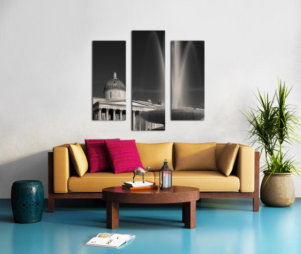 A monochrome photograph of the National Gallery in London framed by the graceful flow of water from one of the iconic fountains in Trafalgar Square. The interplay of light and shadow highlights the historic architecture of the gallery creating a sense of depth and timeless elegance. The fountain in the foreground introduces a serene dynamic element drawing the viewer’s eye through the composition. A perfect photograph for art collectors interior decorators or anyone looking to bring a touch of London’s cultural heritage into their space.
