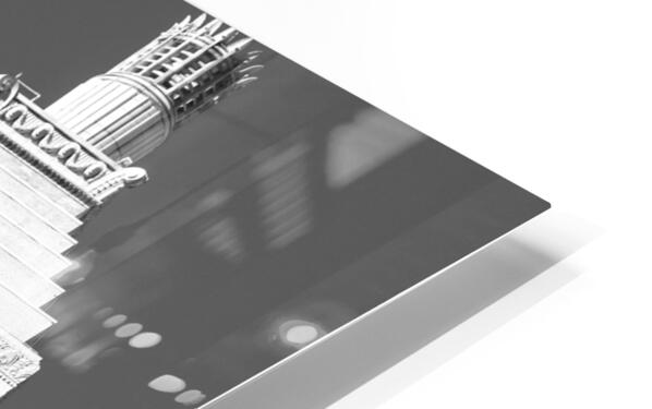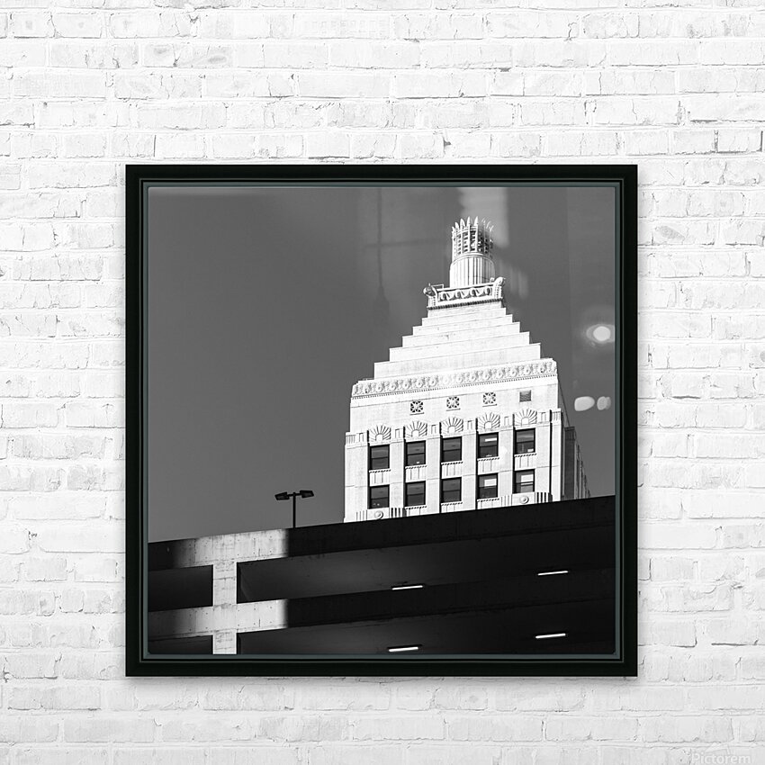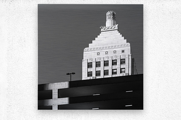 A monochrome photograph of Century Tower in Chicago Illinois with its sunlit peak rising above the edge of a multi-story car park. The composition cre...[+]