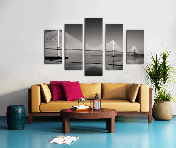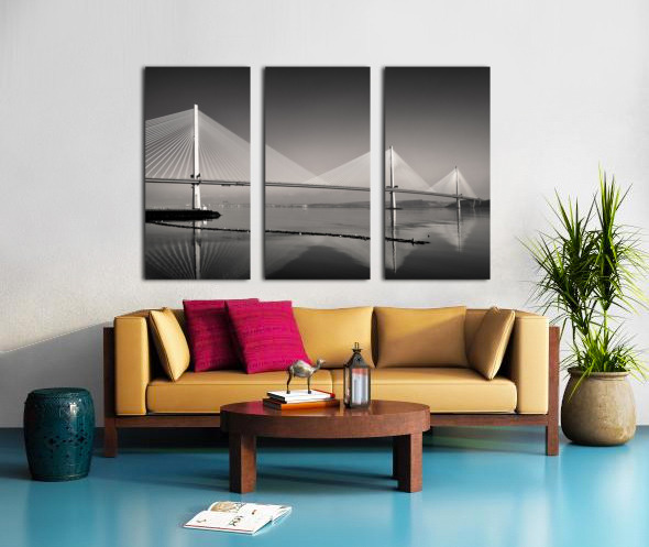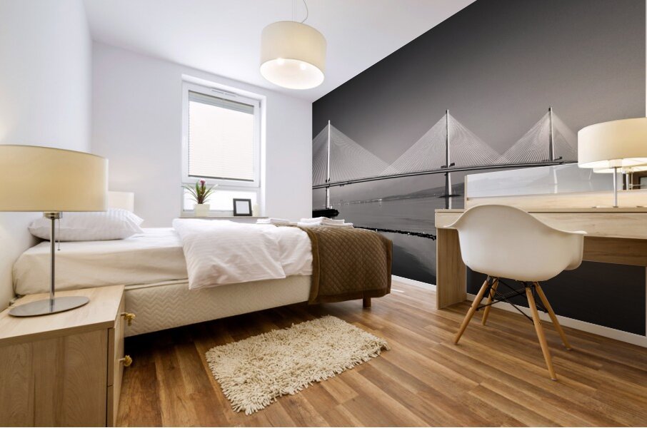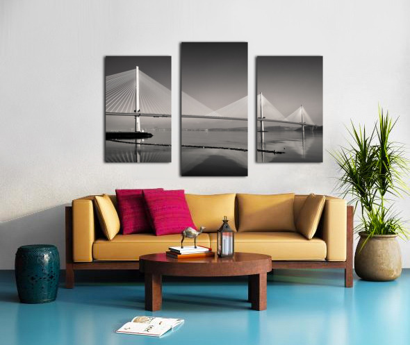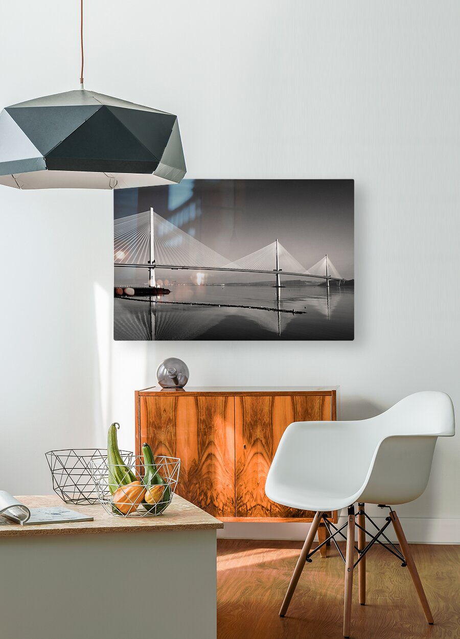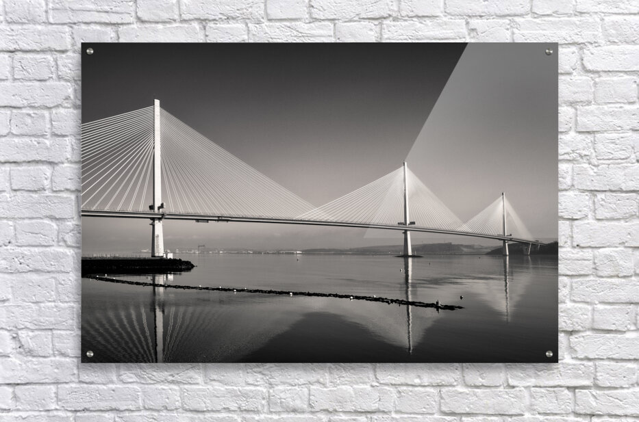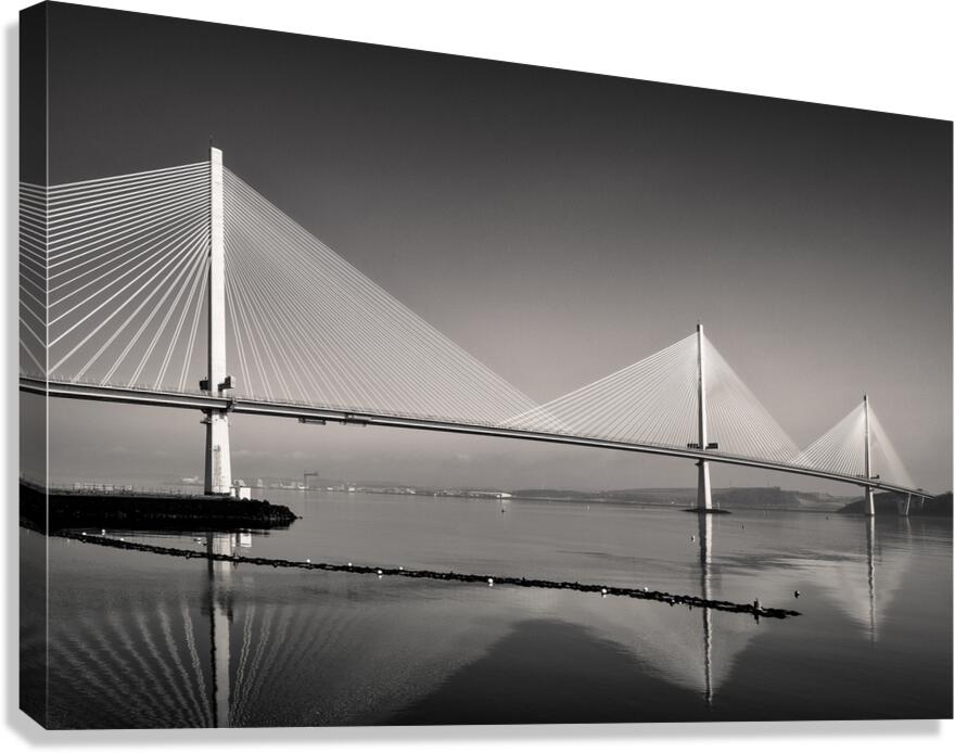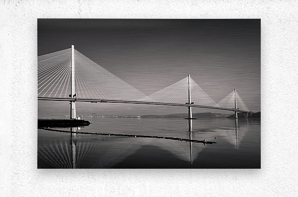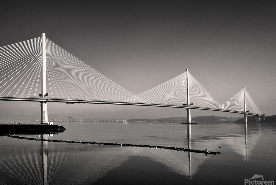 A monochrome photograph highlighting the three towering suspension pillars of the Queensferry Crossing the modern Forth Road Bridge at Queensferry Scotland. The clean lines and striking symmetry of the structure create a sense of strength and elegance. A great photograph for those who admire contemporary engineering and architectural design.