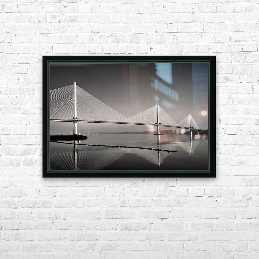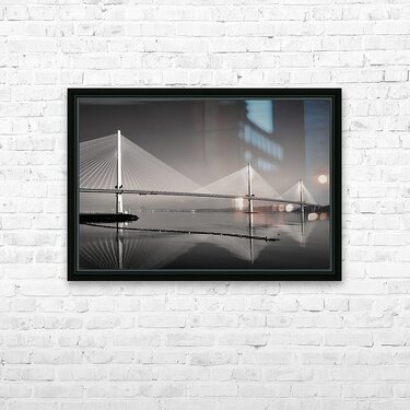 A monochrome photograph highlighting the three towering suspension pillars of the Queensferry Crossing the modern Forth Road Bridge at Queensferry Sco...[+]