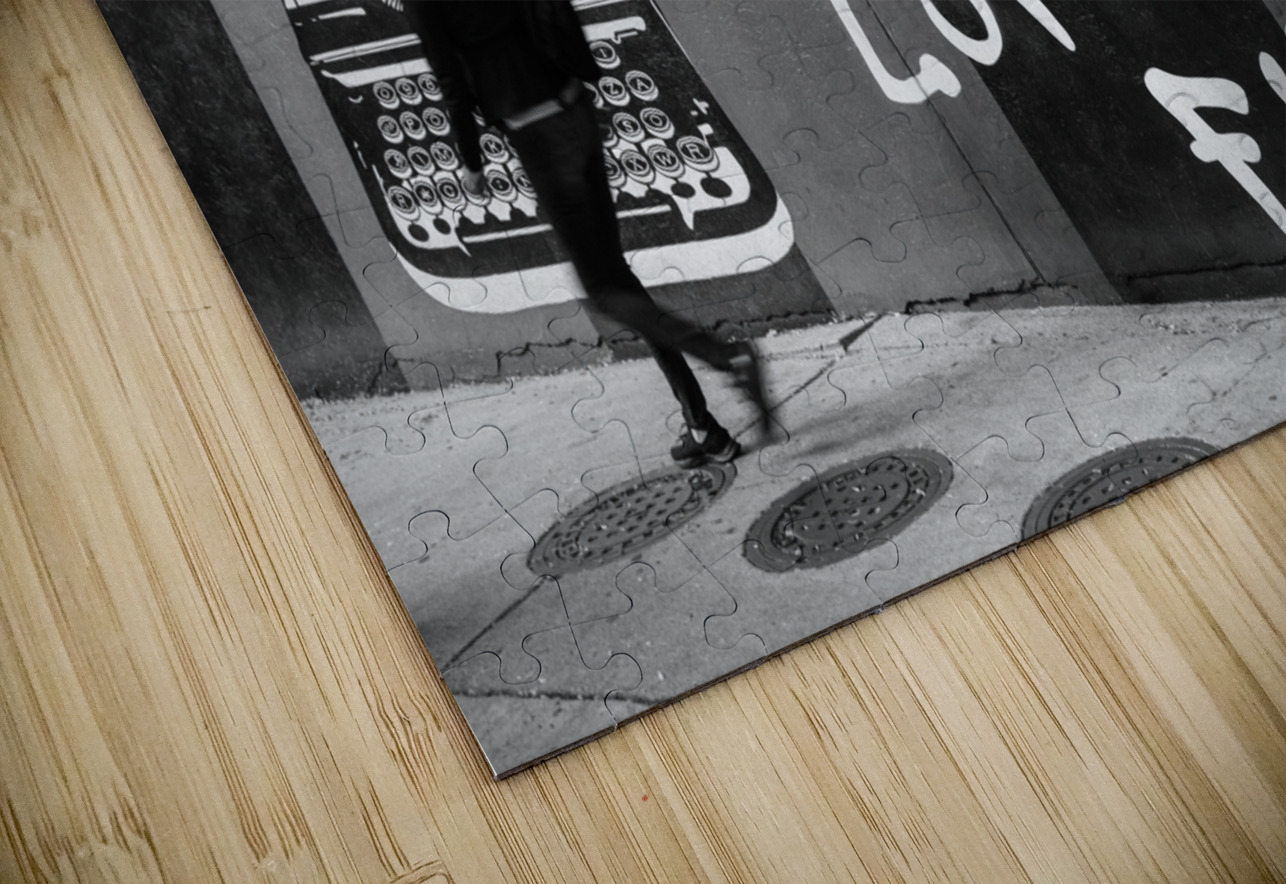 A monochrome photograph of a Chicago street scene capturing a fleeting moment as a woman walks past a mural layered with messages of love creativity and impermanence. The juxtaposition of bold text playful imagery and the quiet motion of the passerby evokes a sense of urban storytelling and introspection. A great photograph for those drawn to the rhythm and soul of city life.