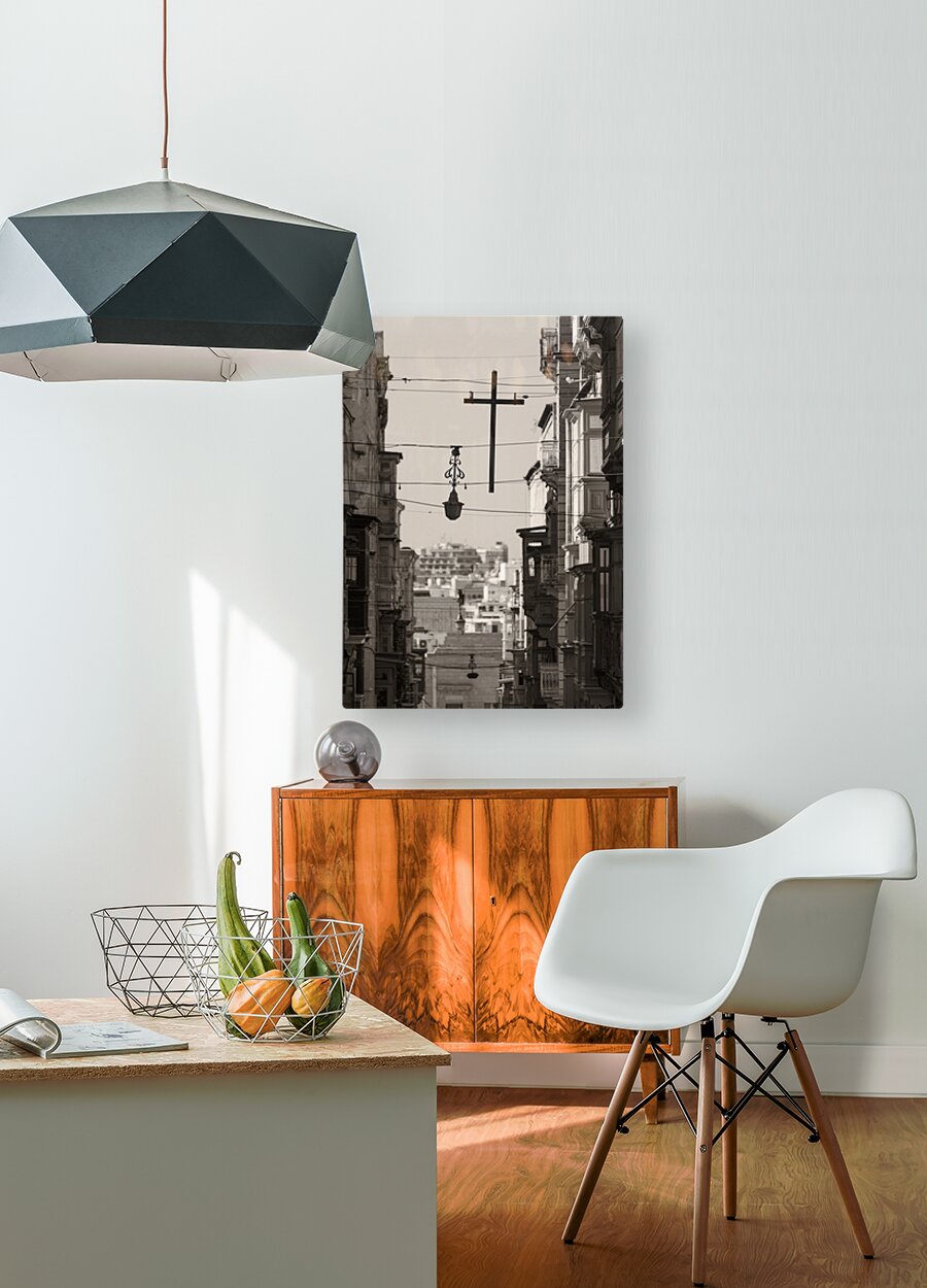 A monochrome photograph capturing the timeless charm of a narrow back street in Valletta the historic heart of Malta. Suspended above the quiet street a cross and an intricately crafted street lamp create a poignant contrast against the softened backdrop of centuries-old urban architecture. A great photograph for those who appreciate the quiet beauty of historic European cities and the interplay of light and shadow in evocative urban scenes.
