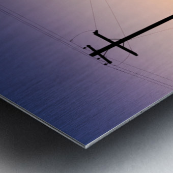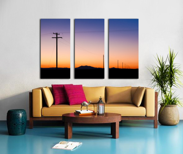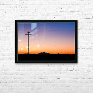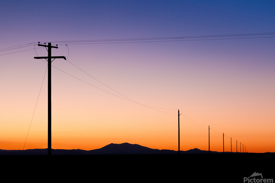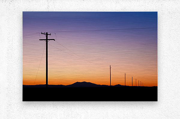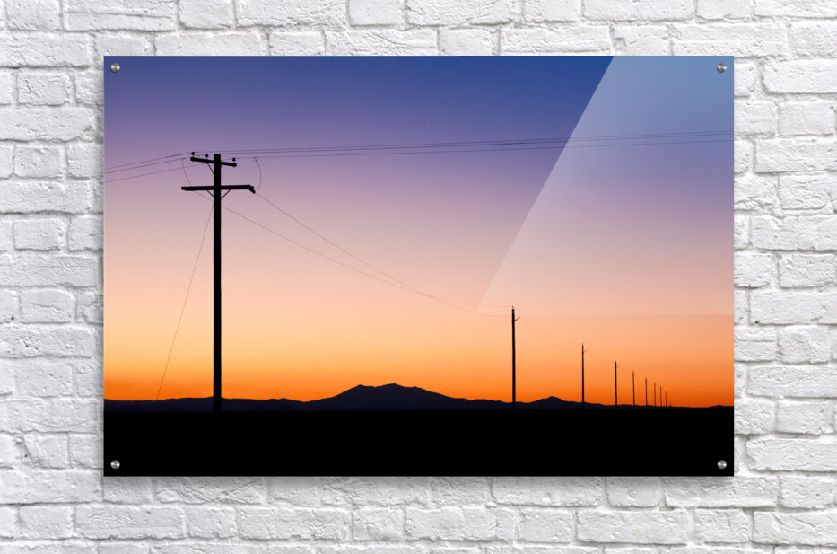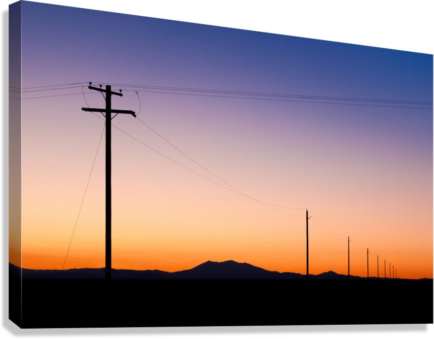 A minimalist photograph capturing the calm of a desert sunset near Winslow, Arizona, along Route 66. With the sun gone, the sky glows in warm orange, yellow, and purple hues, creating a peaceful atmosphere. Telegraph poles recede into the distance, their silhouettes standing stark against the fading light. A great photograph for those who appreciate the simplicity and beauty of the American Southwest.