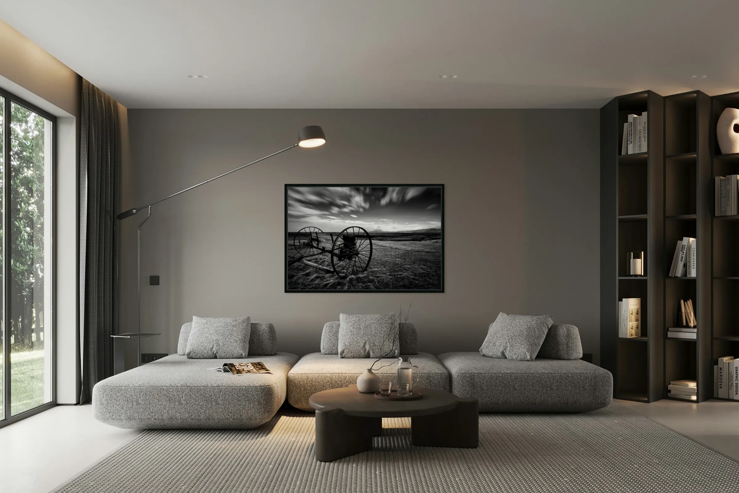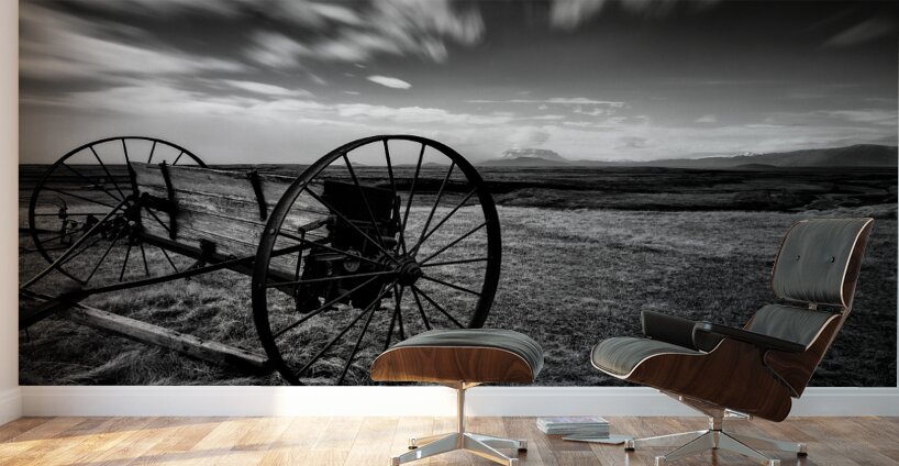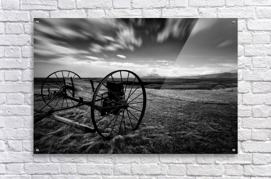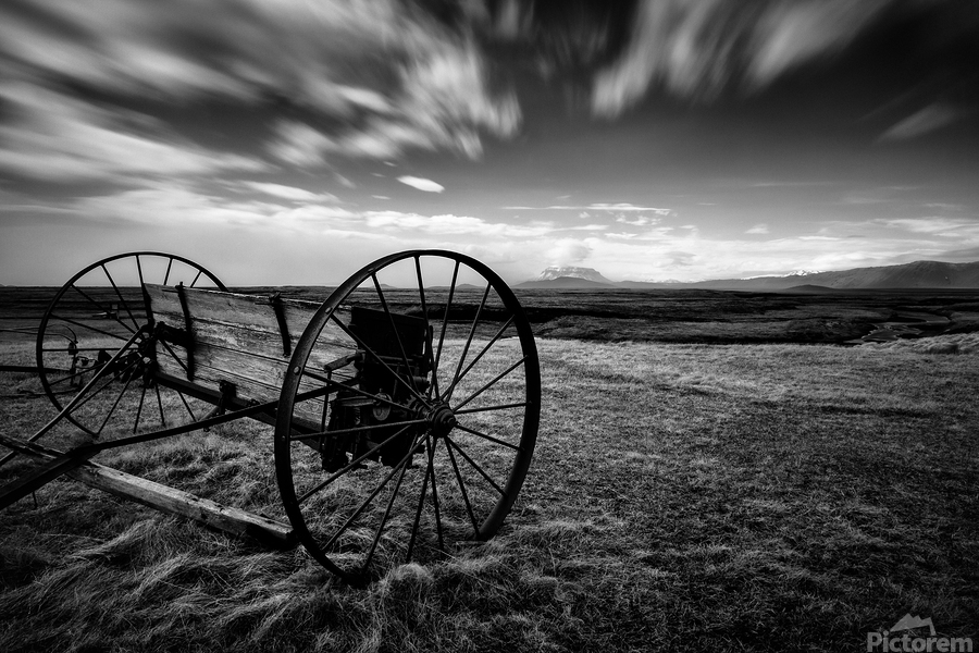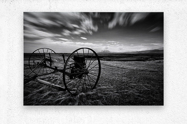 A black and white long-exposure photograph featuring vintage farm machinery in the vast open fields of Modrudalur Icelands highest farm settlement. The weathered machinery tells a quiet story of the past while the dramatic sky with streaks of moving clouds adds a sense of timelessness and power to the scene. This photograph captures the rugged beauty and solitude of Icelands remote landscapes making it a perfect addition for those seeking to bring the raw authentic spirit of Iceland into their space.
