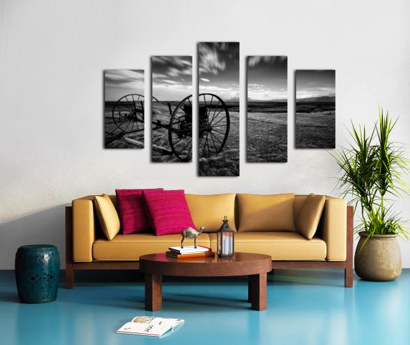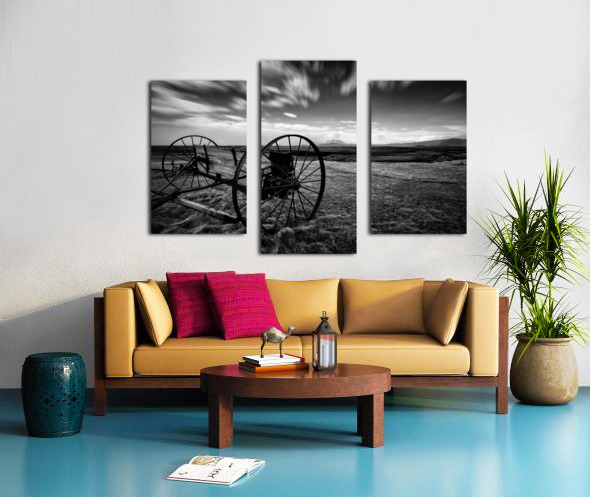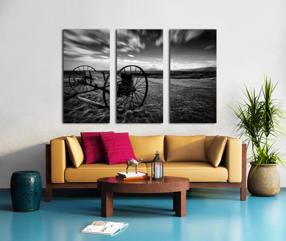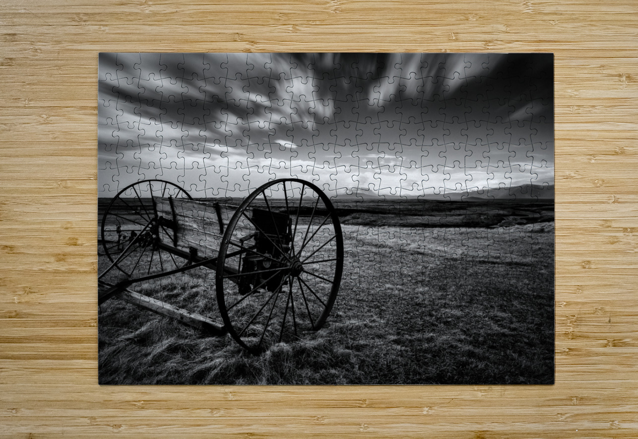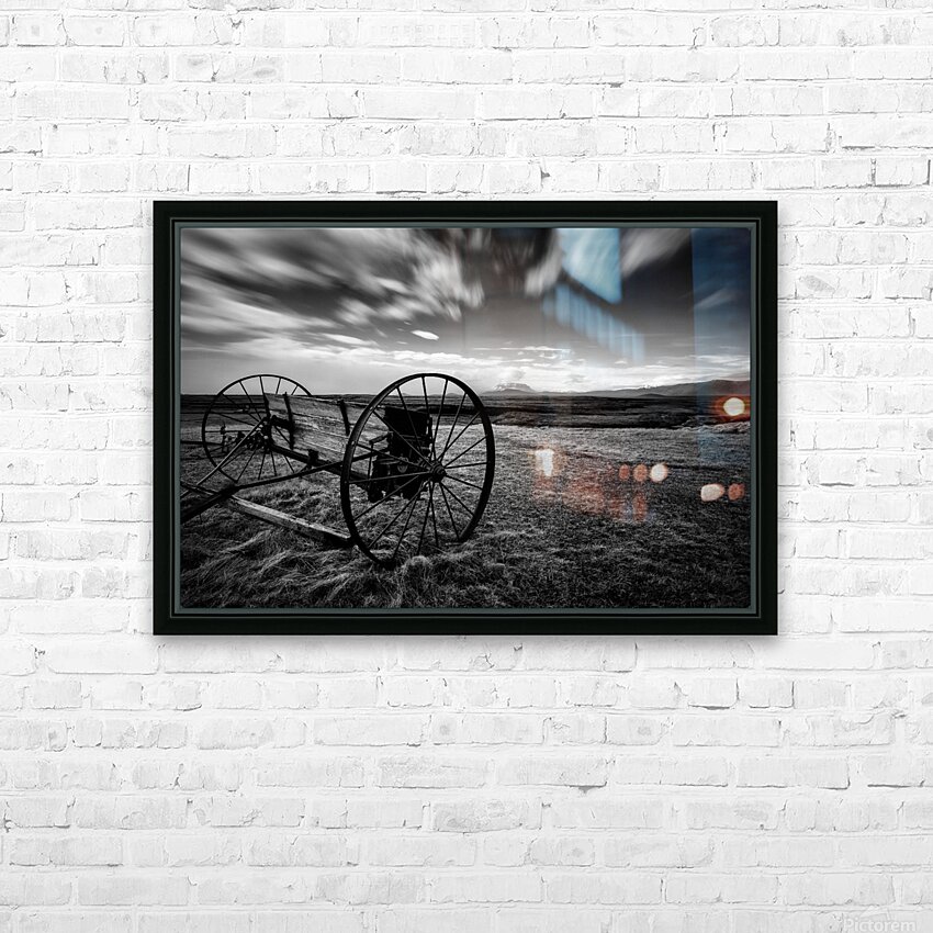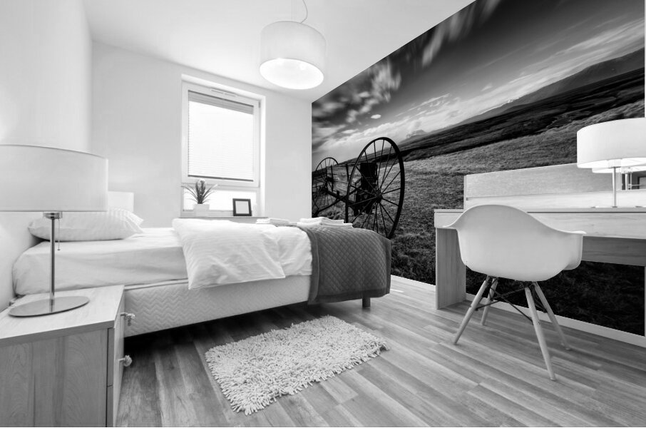A black and white long-exposure photograph featuring vintage farm machinery in the vast open fields of Modrudalur Icelands highest farm settlement. The weathered machinery tells a quiet story of the past while the dramatic sky with streaks of moving clouds adds a sense of timelessness and power to the scene. This photograph captures the rugged beauty and solitude of Icelands remote landscapes making it a perfect addition for those seeking to bring the raw authentic spirit of Iceland into their space.