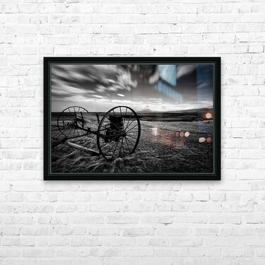 A black and white long-exposure photograph featuring vintage farm machinery in the vast open fields of Modrudalur Icelands highest farm settlement. Th...[+]