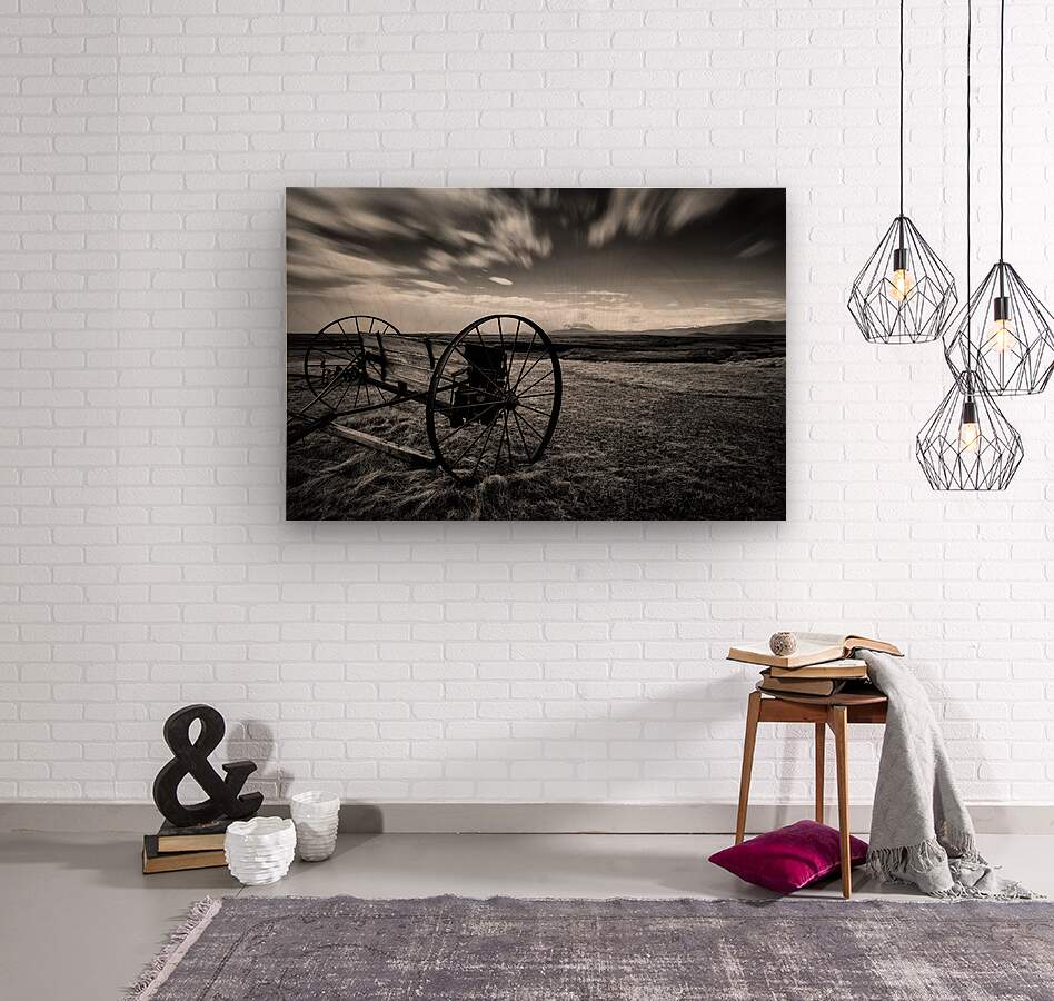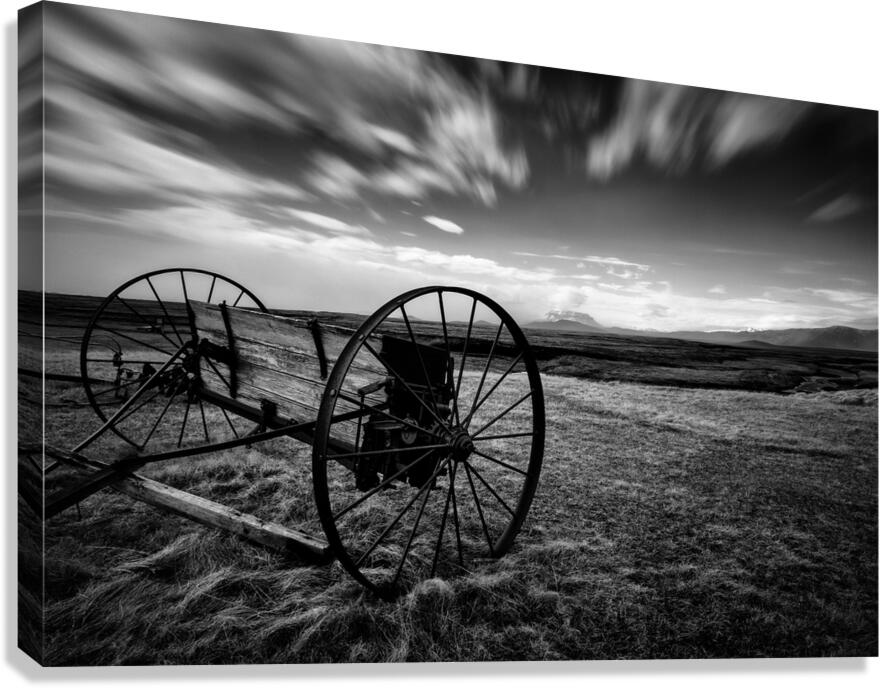 A black and white long-exposure photograph featuring vintage farm machinery in the vast open fields of Modrudalur Icelands highest farm settlement. The weathered machinery tells a quiet story of the past while the dramatic sky with streaks of moving clouds adds a sense of timelessness and power to the scene. This photograph captures the rugged beauty and solitude of Icelands remote landscapes making it a perfect addition for those seeking to bring the raw authentic spirit of Iceland into their space.