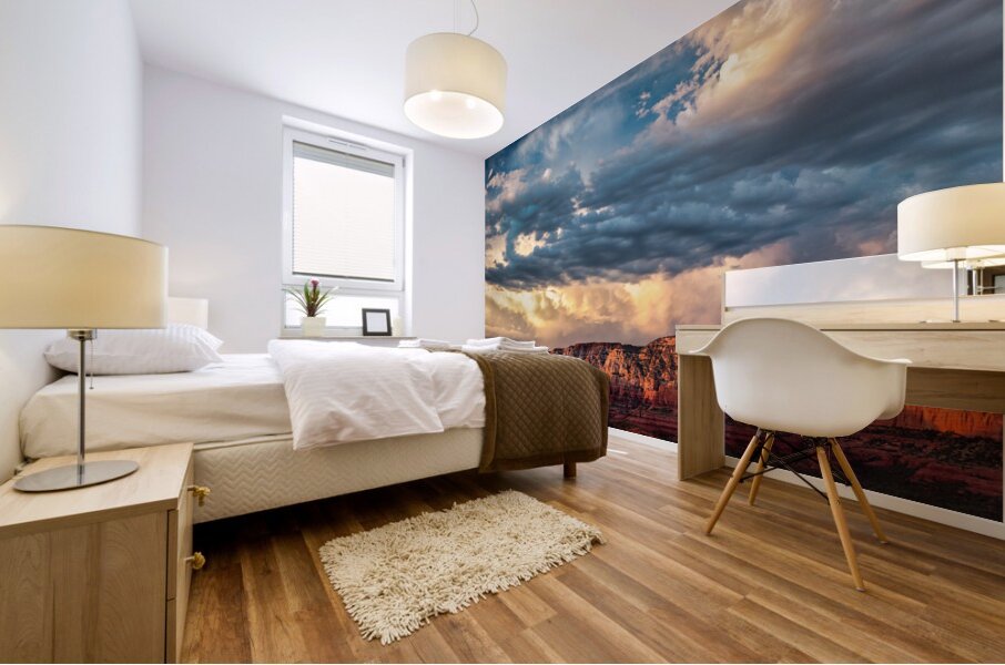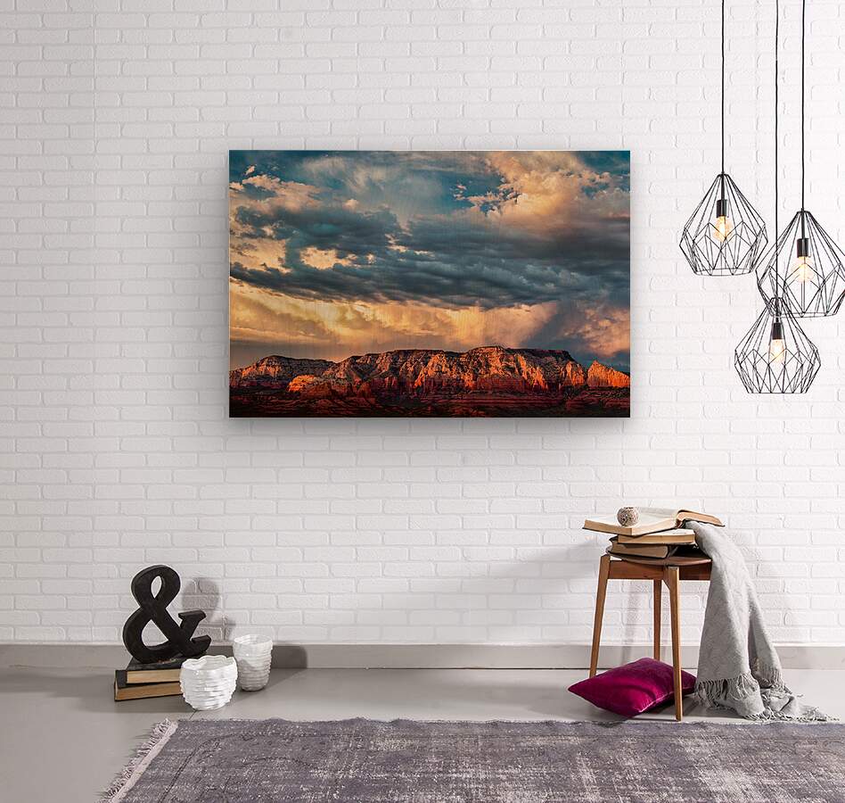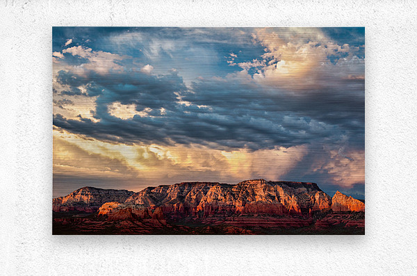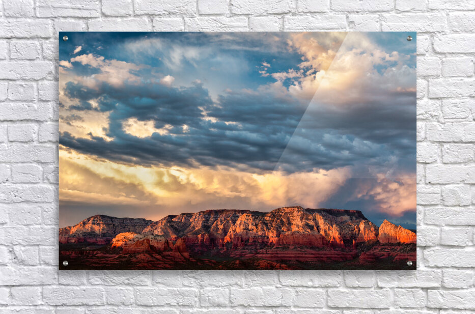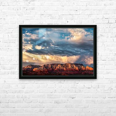 A dramatic storm front builds over the red rocks of Sedona at sunset casting deep shadows and rich hues across the rugged terrain. The interplay of storm clouds and warm light creates an atmosphere of both intensity and beauty capturing the raw essence of Arizonas iconic landscape. A great photograph for those inspired by the power and grandeur of natures contrasts.