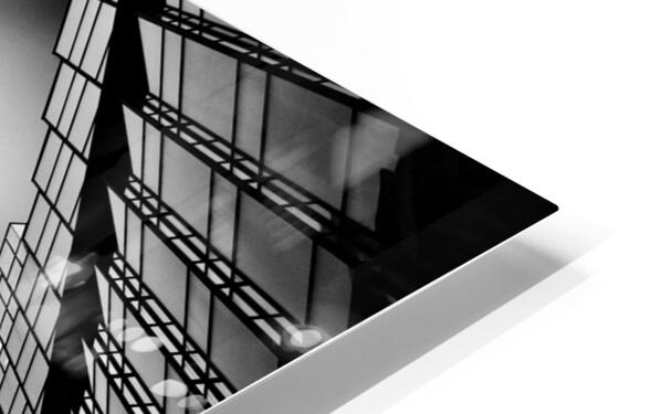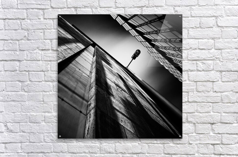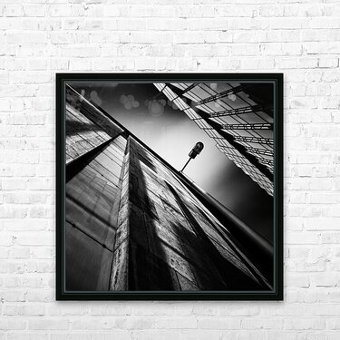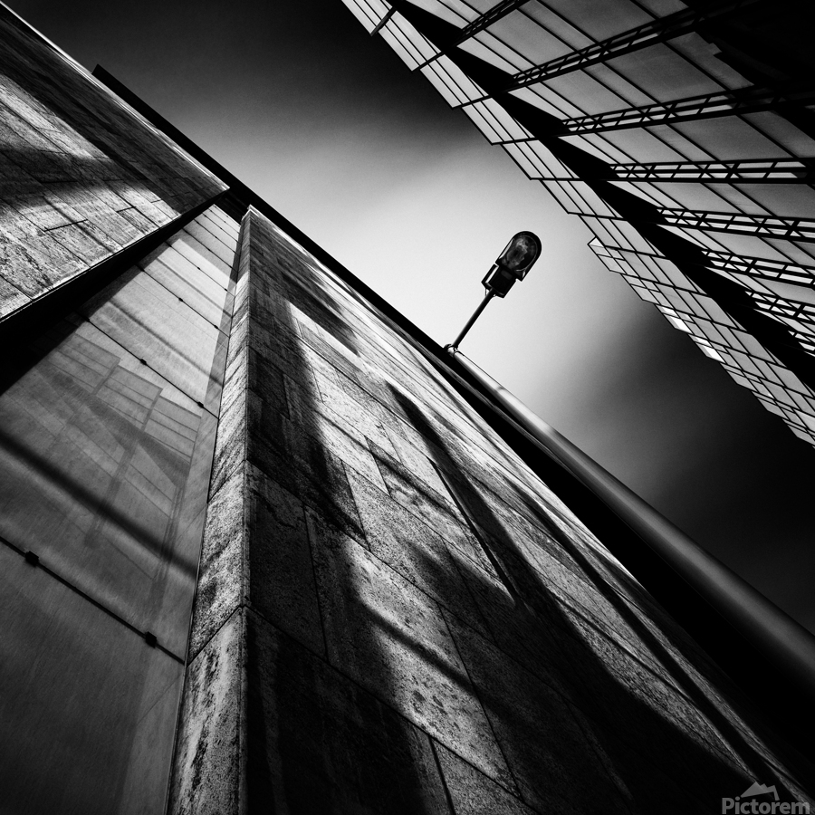 An architectural study capturing an alley lamp in an Amsterdam side street viewed from a striking upward angle between two buildings. The bold lines o...[+]